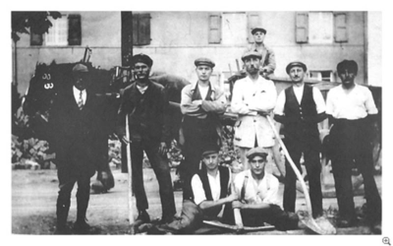 Wir treffen auf eine Gruppe Strassenarbeiter, die um 1910 auf der Mühlenstrasse, heute Hitdorfer Strasse, beschäftigt sind. Der vierte stehend von links ist der ehemalige Schuldiener Peter Schumacher, genannt "Bismarck".