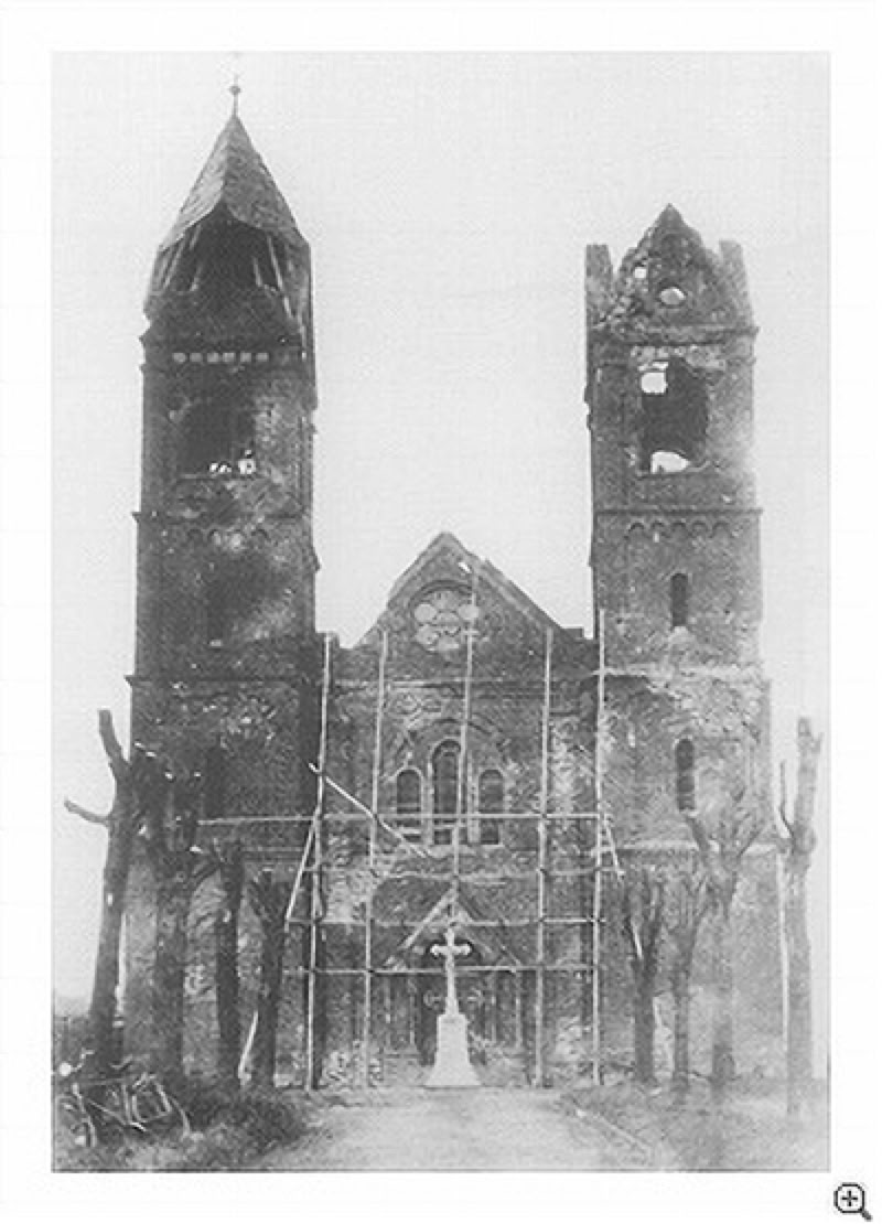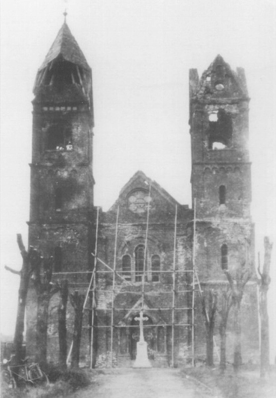 Die St. Stephanus Kirche in den 1950er Jahren. Man sieht gut die Reparaturarbeiten der Kriegsschäden.