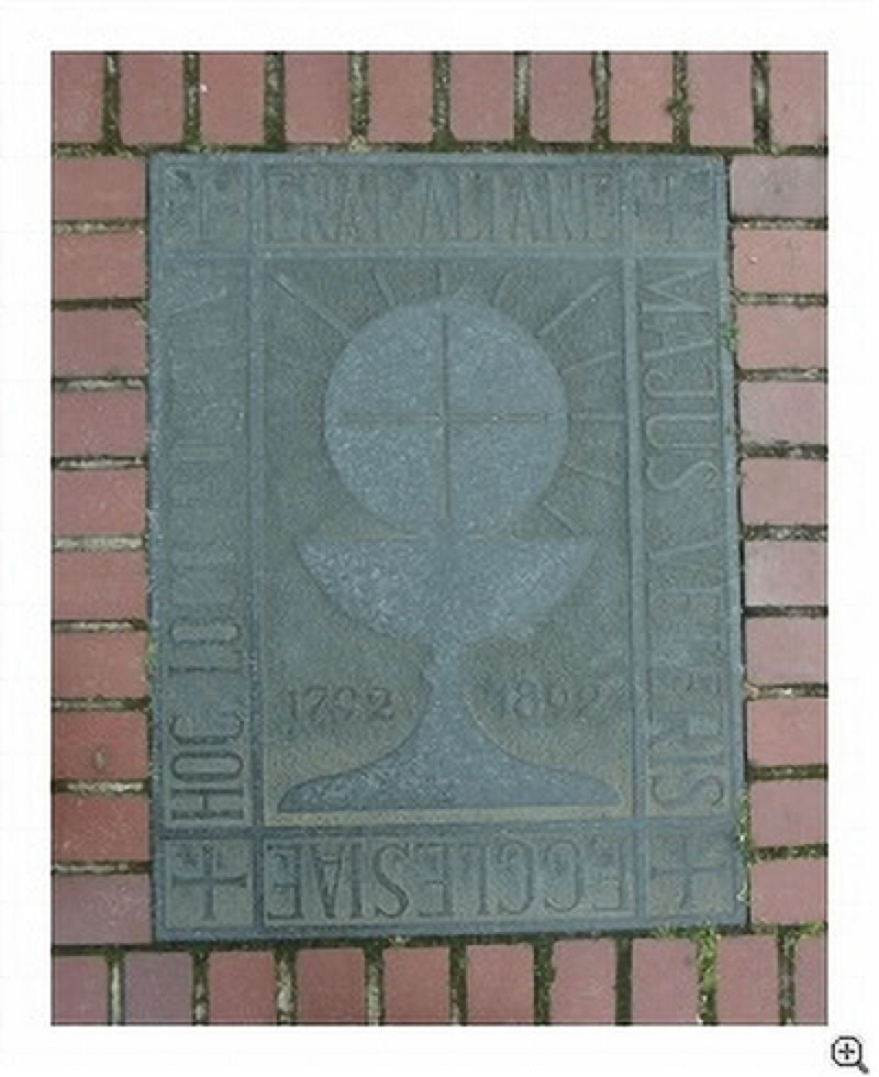 Die Gedenkplatte vor dem Hauptportal der St. Stephanus Kirche. Auf der Platte steht auf Latein geschrieben: