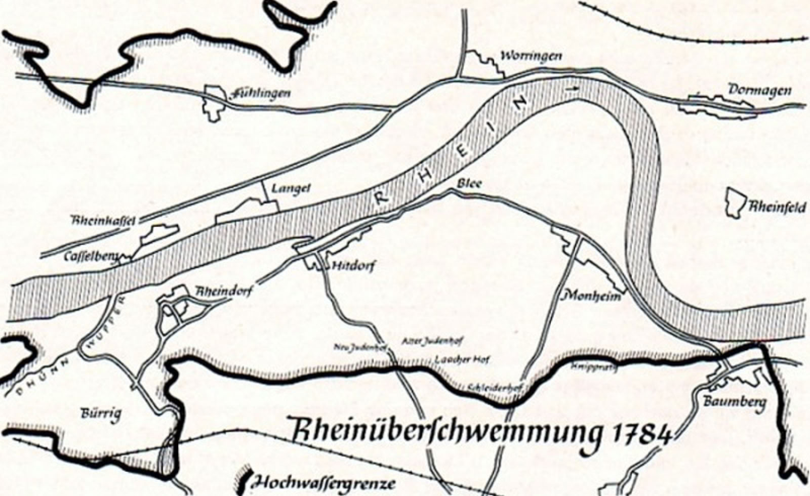 Und somit verbindet die Hitdorfer bis heute eine Hassliebe zu ihrem Fluss. Sie lieben ihn heiss und innig an schönen warmen Sommertagen…und hassen ihn, sobald er mit seinen Wellen die erste Bordsteinkante „küsst“ und ihnen droht, mehr als nur die Füsse nass zu machen!
