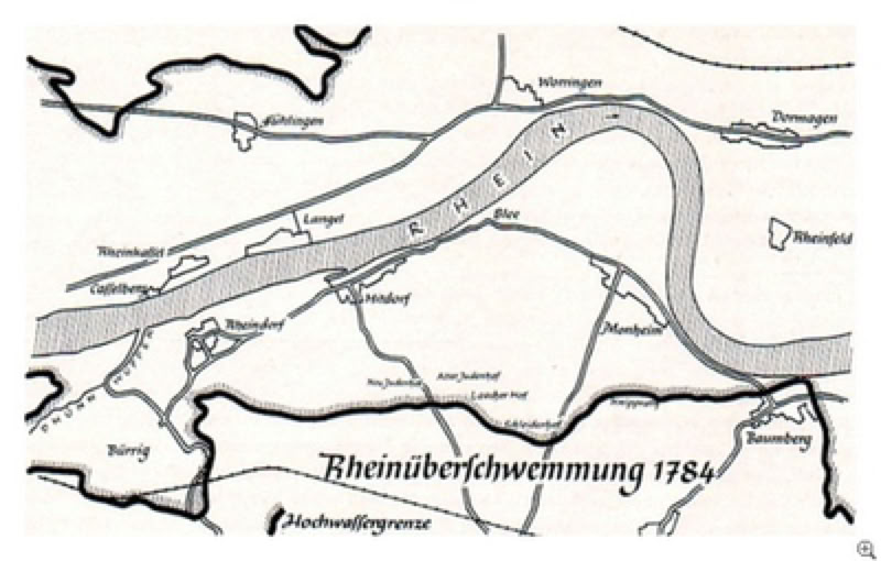 Eine alte Karte mit den Markierungen der Hochwasserfläche von 1784