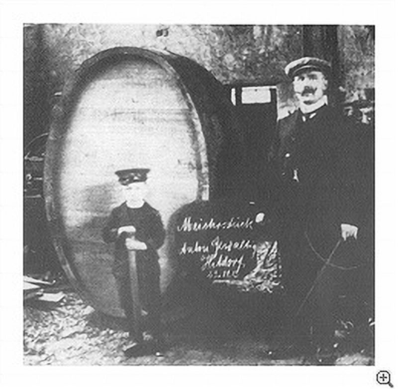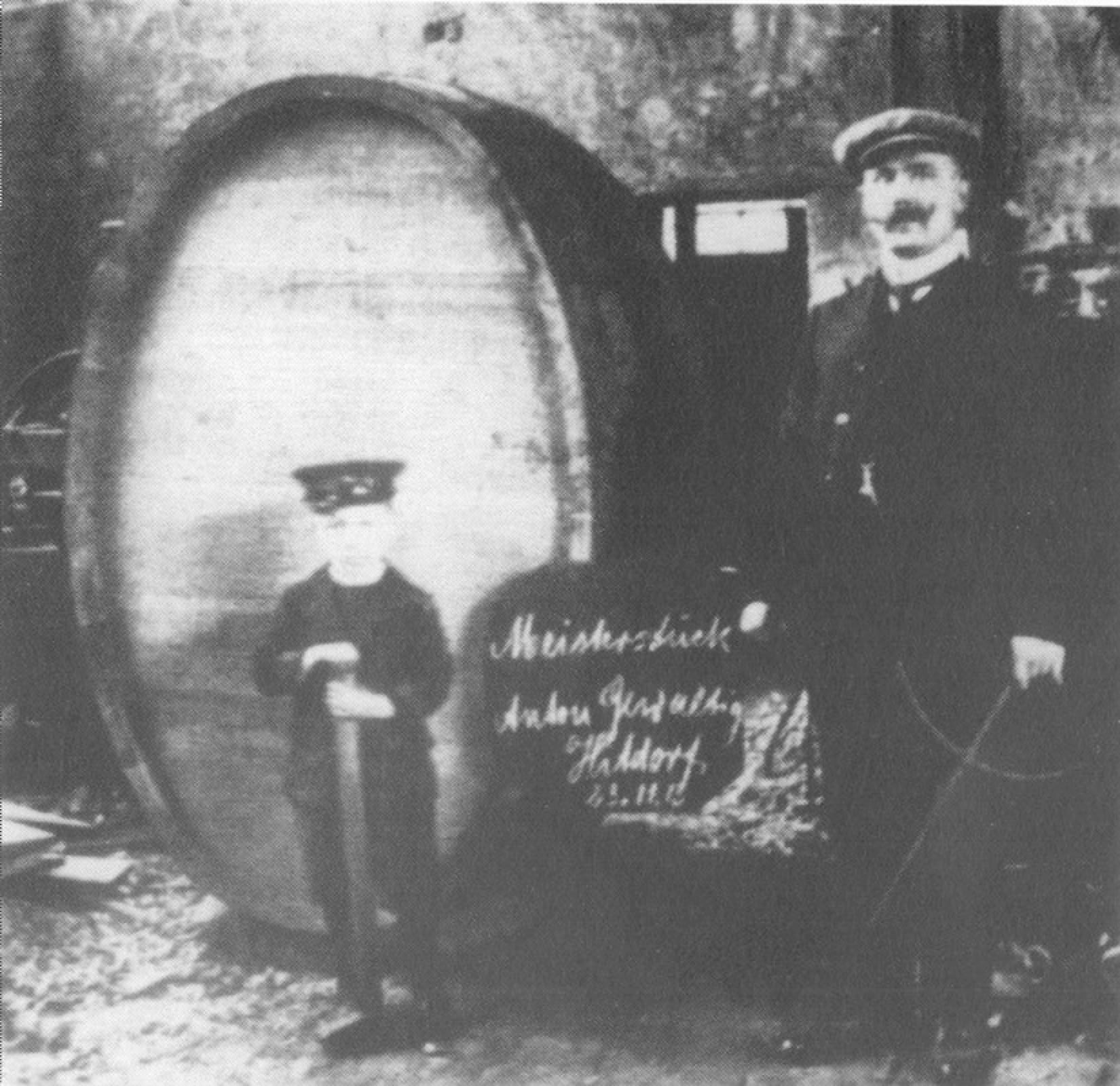Die Fassfabrik (Böttcherei) von Bernhard Gewaltig, die von Anton und Franz Gewaltig weitergeführt wurde. Dritter von links: Anton Gewaltig, vor ihm sein Sohn Peter. Ganz rechts steht der Geselle Hans Hoffmann.