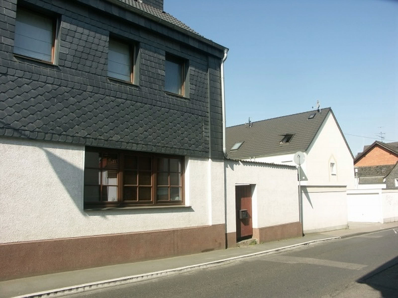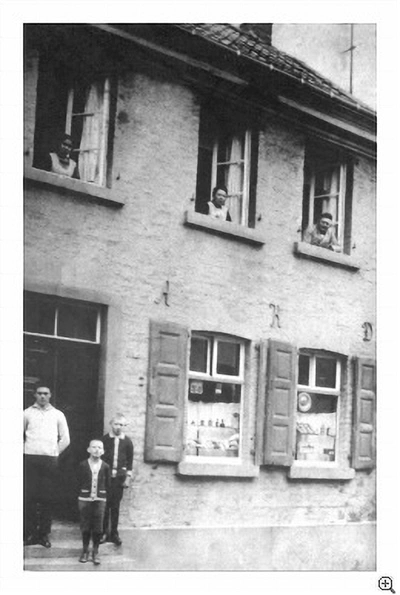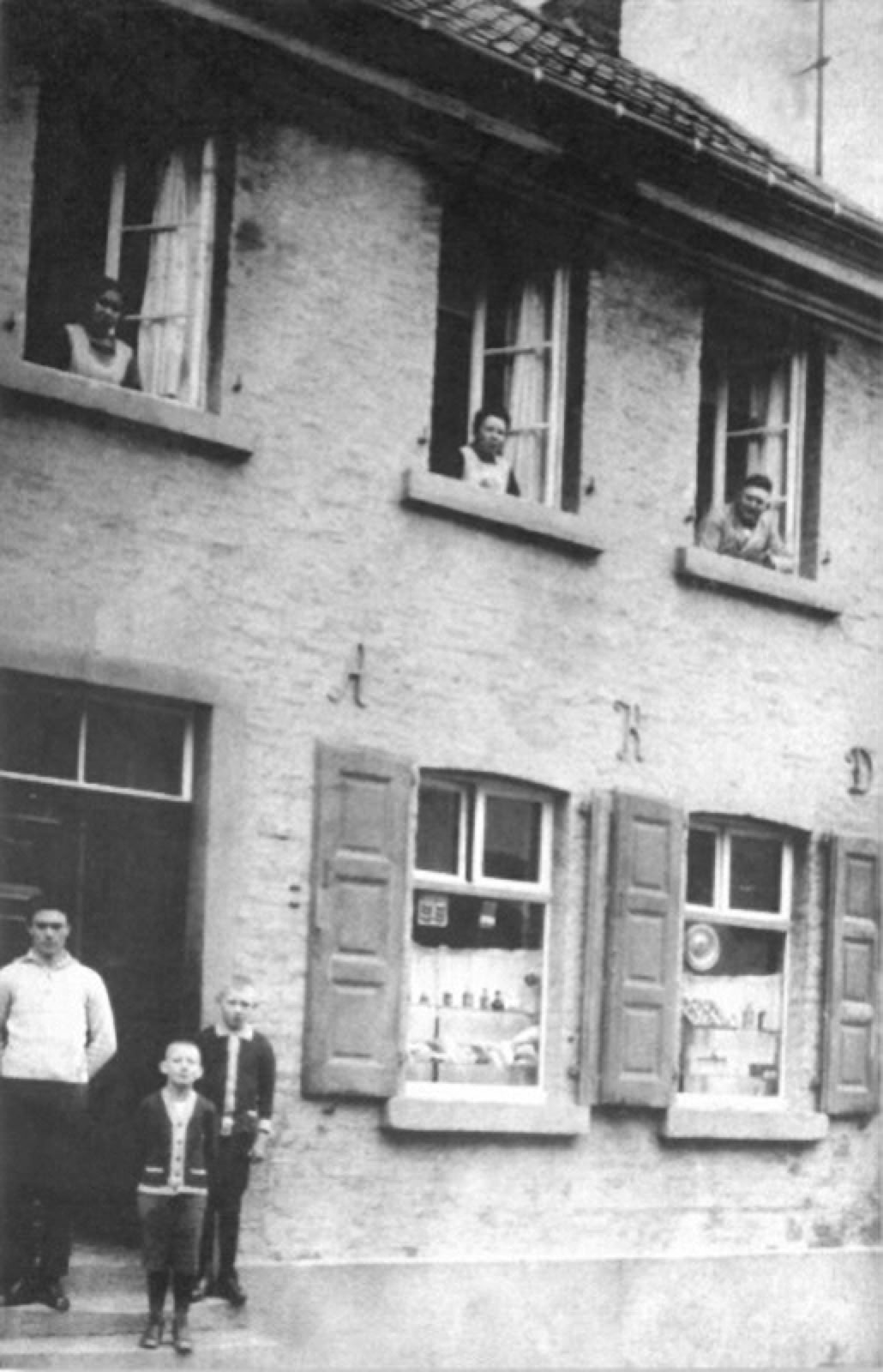 In dem Haus an der heutigen Hitdorfer Straße 171 wohnte Familie Schwippert. Oben rechts im Fenster ist Frisörmeister Johann Schwippert zu sehen, in der Mitte seine Ehefrau.