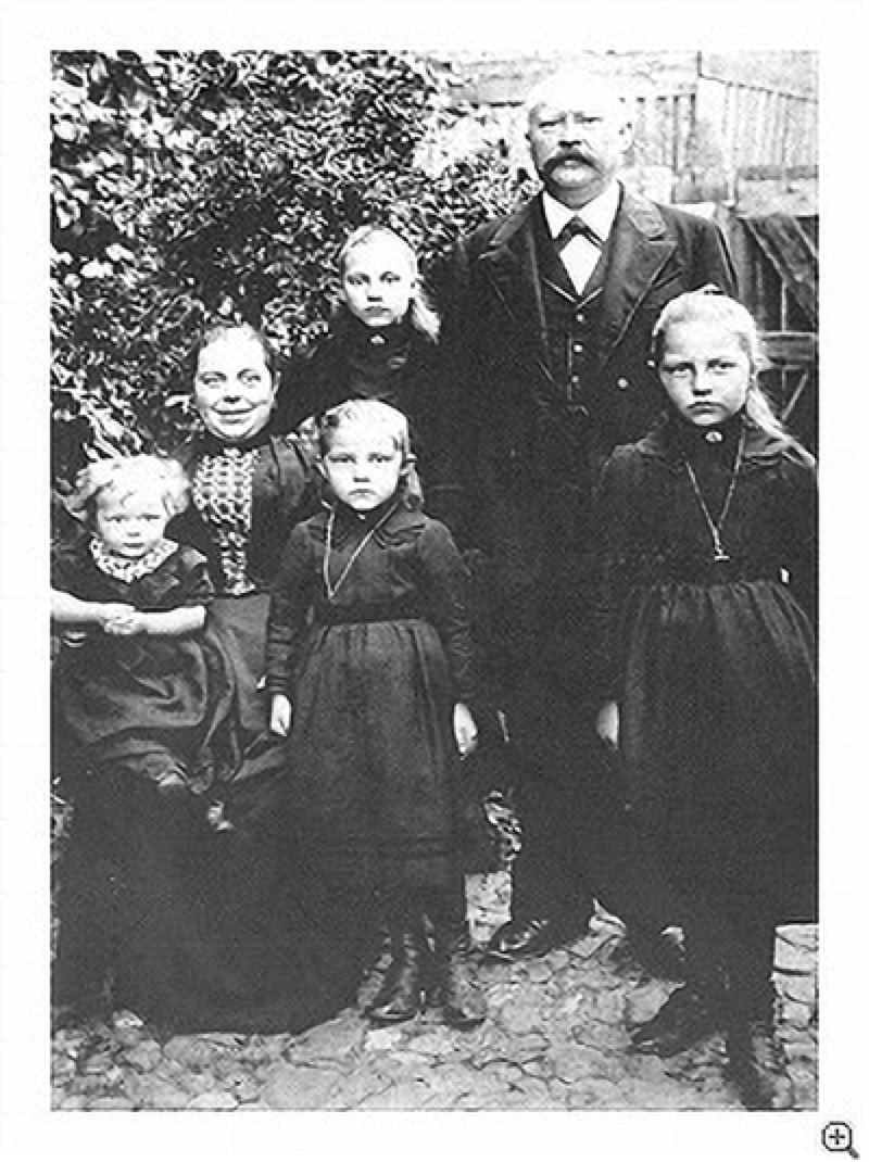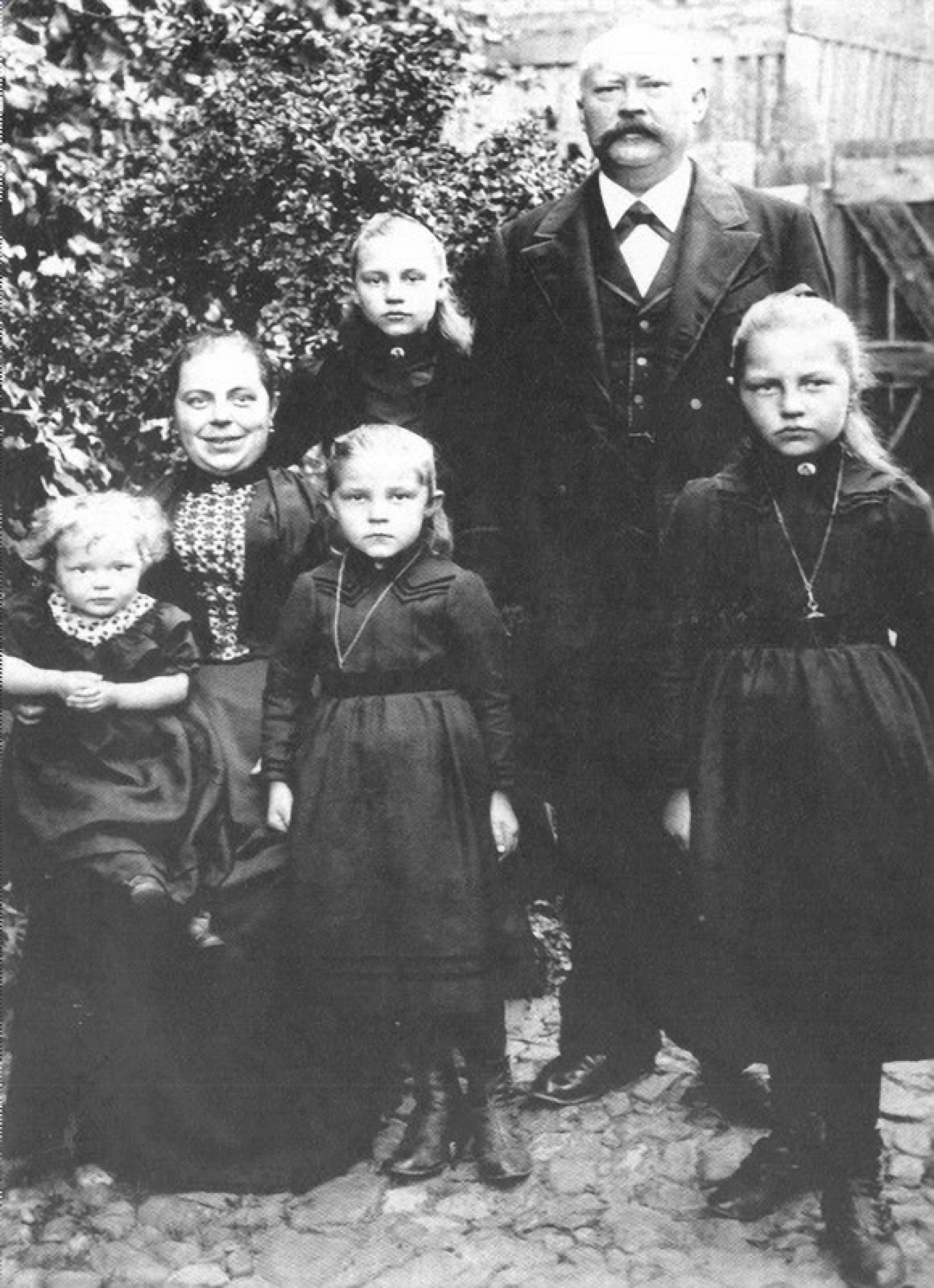 Familie Peter Keller. Frau Keller war eine geborene Kürten. Rechts im Bild ist Tochter Anna, "et Kellesch Ann", zu sehen, die später Klaus Leven heiratete.