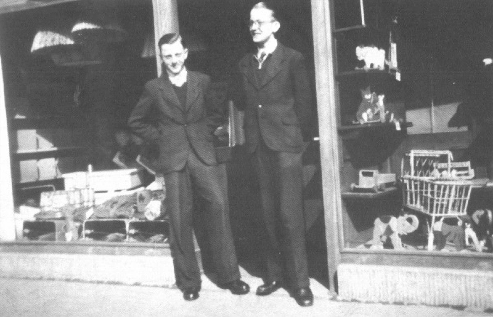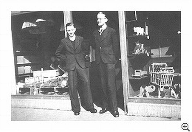 Die Söhne Otto und Julius Schlupp vor dem Schaufenster des elterlichen Hauses um 1950