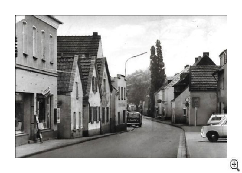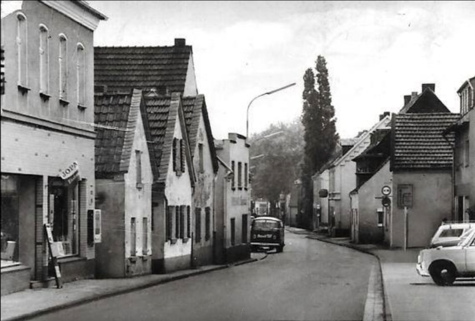 Mühlenstrasse / Hitdorfer Strasse mit Blickrichtung Fährstrasse. Links das Haus Leven um 1970. Die kleinen Häuser hinter Haus Leven sind heute der Standort der ehem. Kneipe „Alt Hitdorf“, dem Reisebüro Veramar und dem Reha-Zentrum Hitdorf vorm. Schlecker und SPAR-Markt.