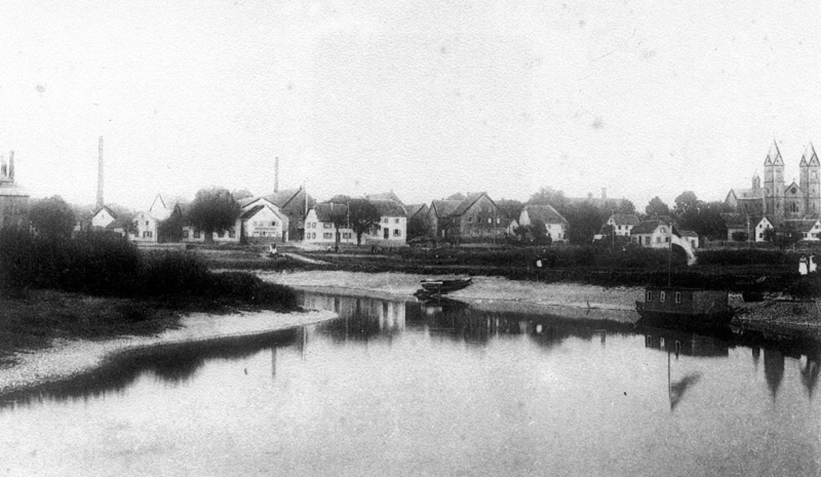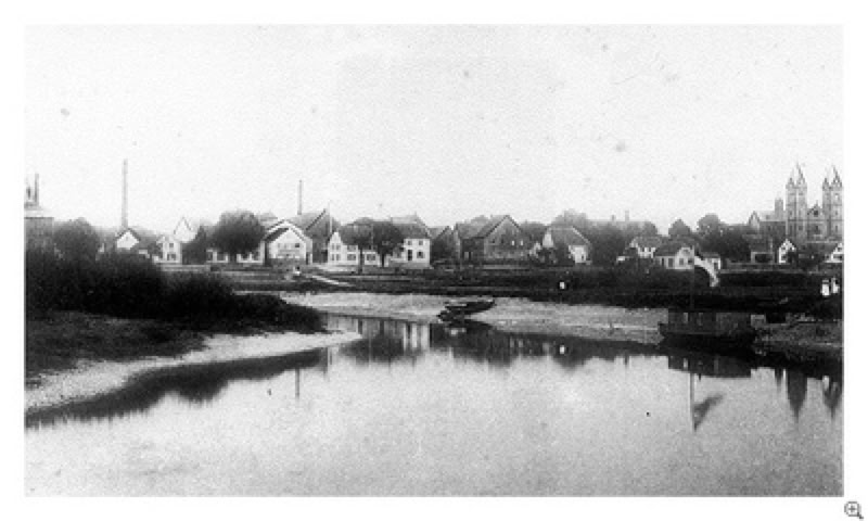 Das Meyer's Loch mit Fährhütte. Rechts die St. Stephanus Kirche, links die Schornsteine der Firma Fitzen und der Brauerei AG um 1920