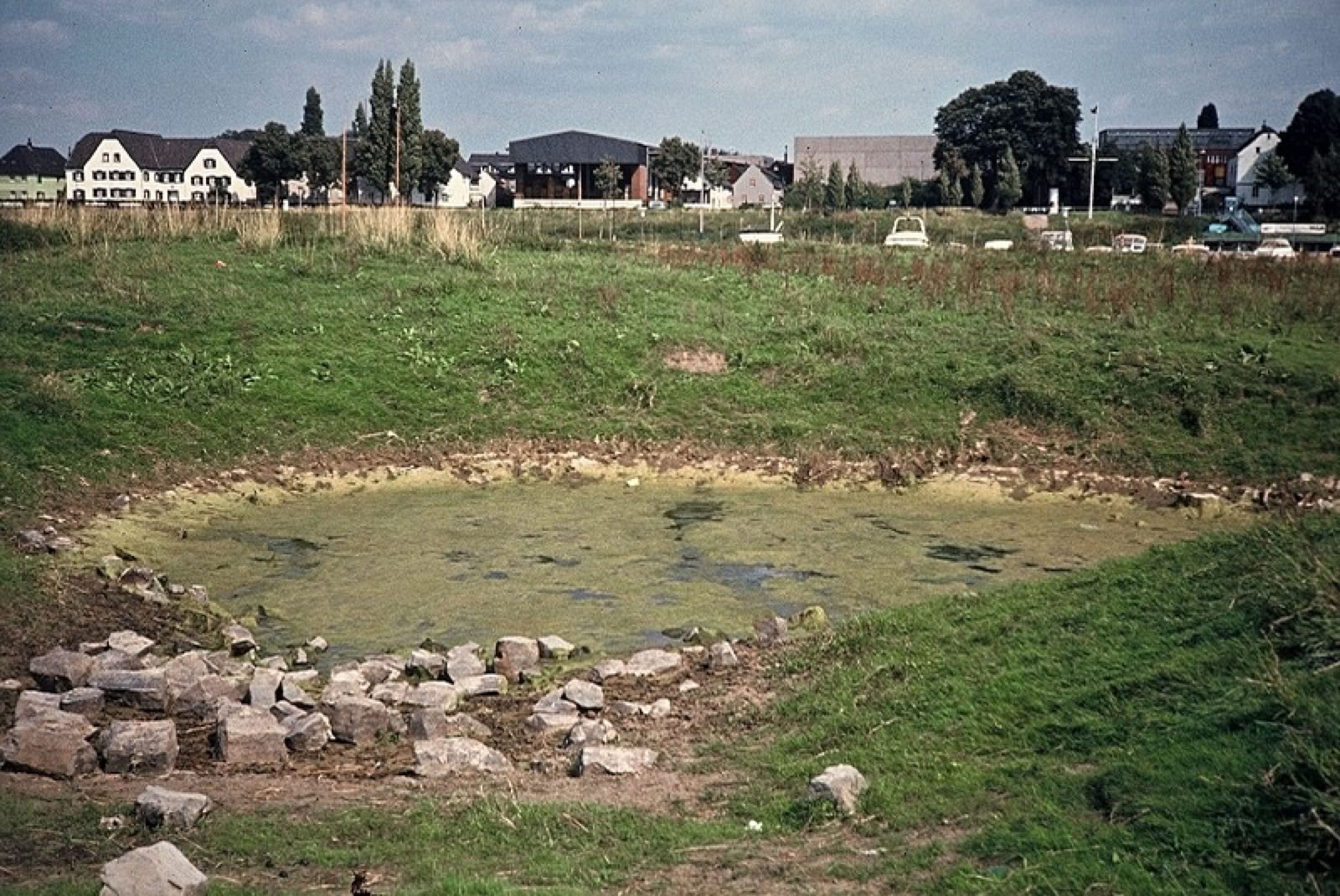 Das Meyer's Loch war ein bei den Hitdorfer Kindern beliebter Froschtümpel und wurde etwa Mitte der 80er Jahre mit dicken Wackermännern zugeschüttet.