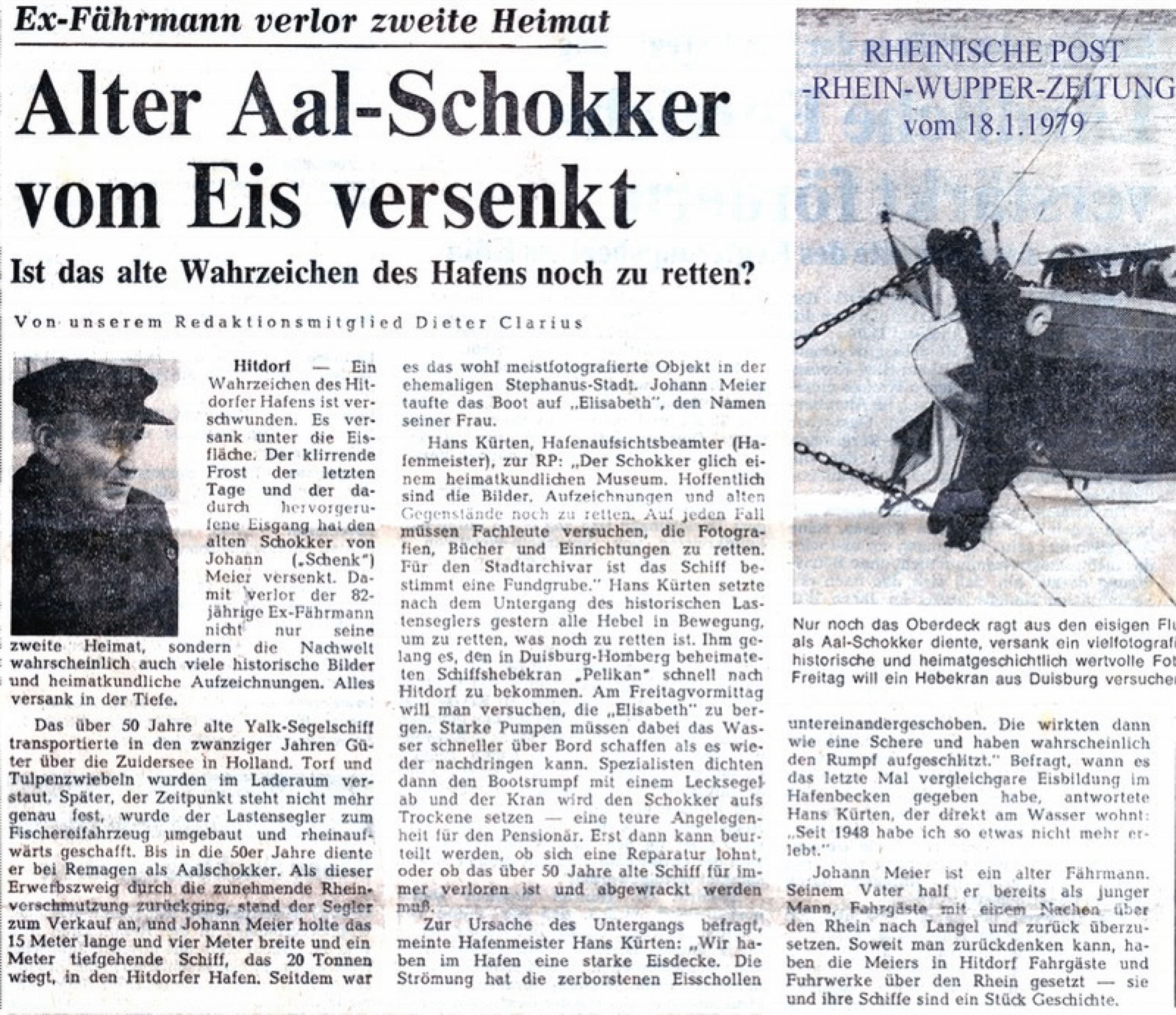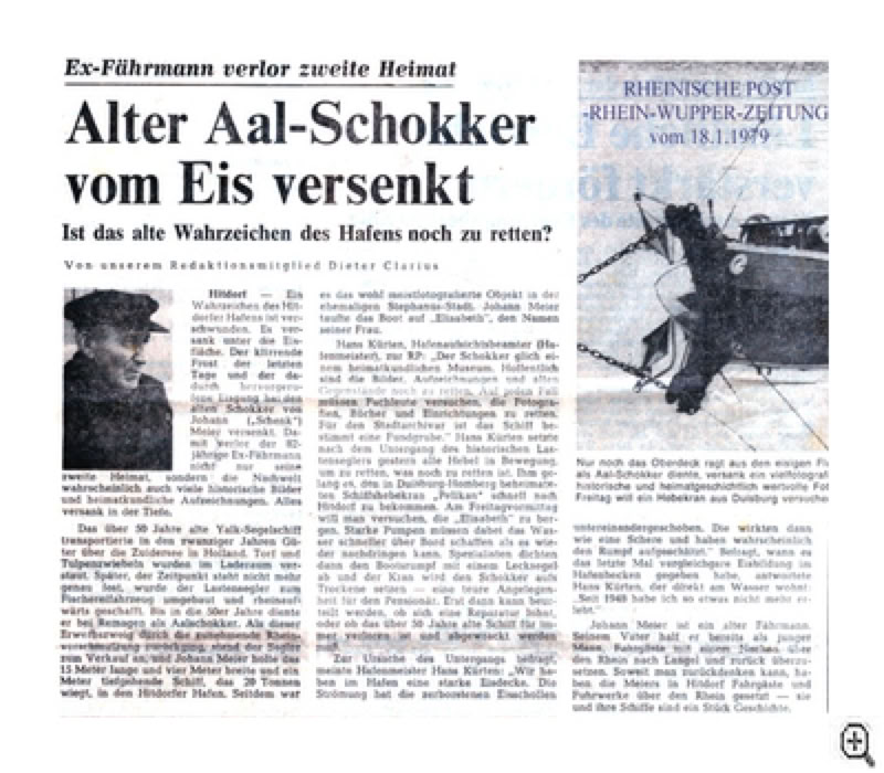 Schäng hatte, als alter Seemann und Absolvent der kaiserlichen Kriegsmarine (er hat auf der S.M.S Hohenzollern gedient), diesen Schokker eigenhändig aus Remagen geholt und im Hitdorfer Hafen vor Anker gelegt.