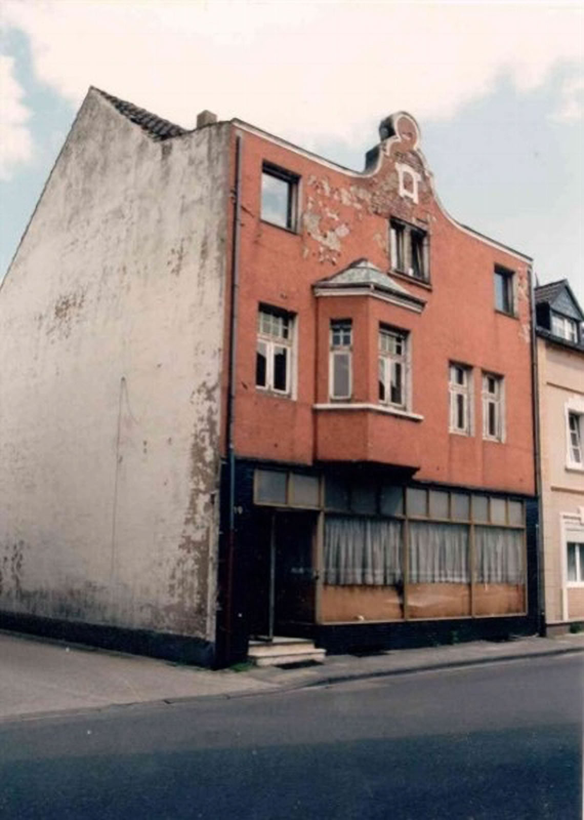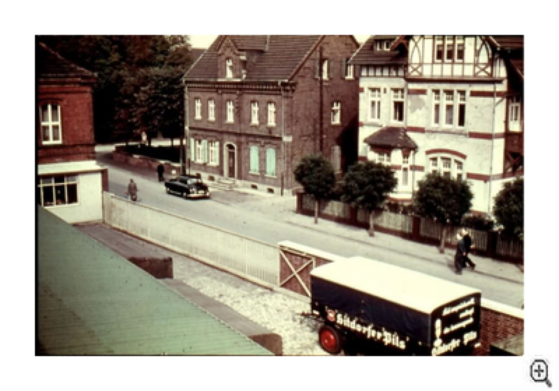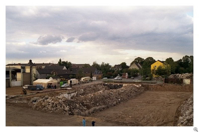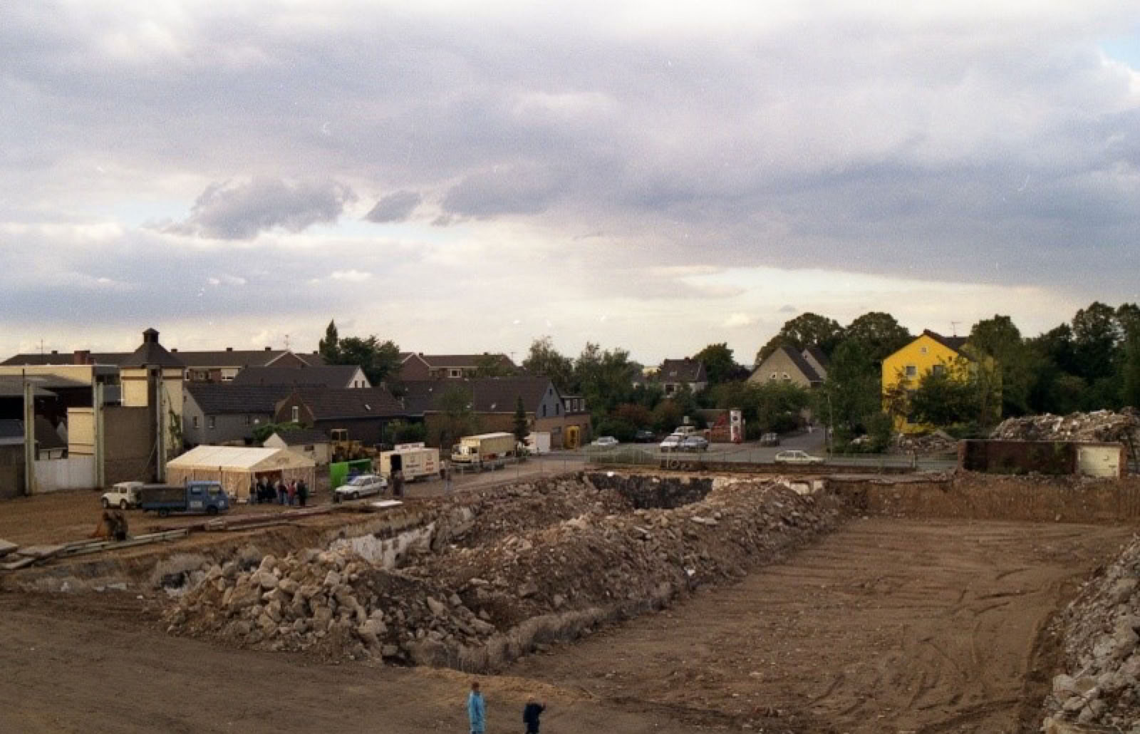 Von einem Gebäude der Hitdorfer Brauerei AG haben wir eine gute Aussicht auf das Backsteinhaus der Hitdorfer Brauerei AG und die Villa Freiburg. Björn Hölscher hatte das seltene Glück von fast der selben Stelle ein Foto über das Abrissgelände und das erst 1971 erbaute neue und schon 1989 wieder abgerissene Verwaltungsgebäude der Hitdorfer Brauerei AG zu machen