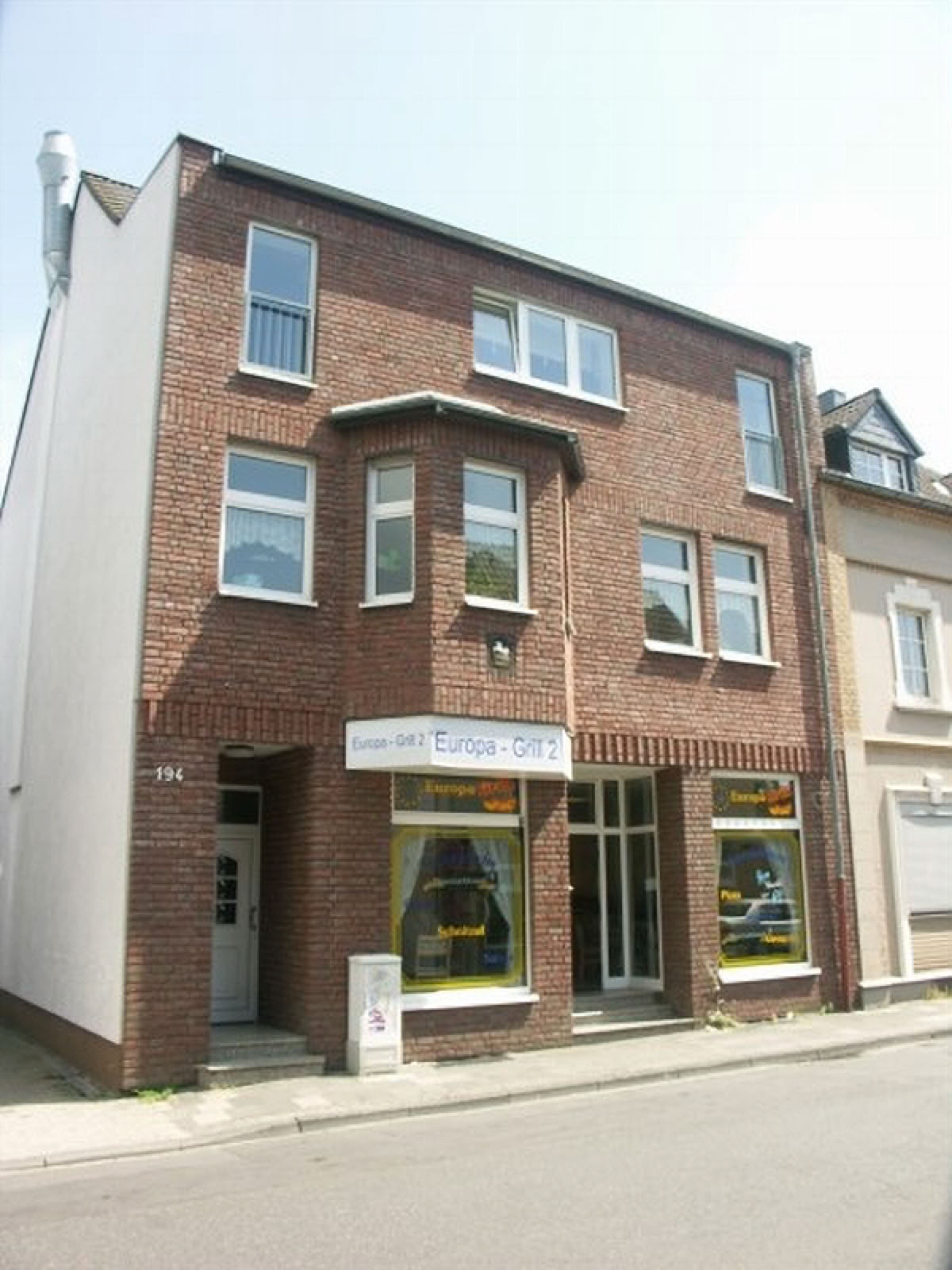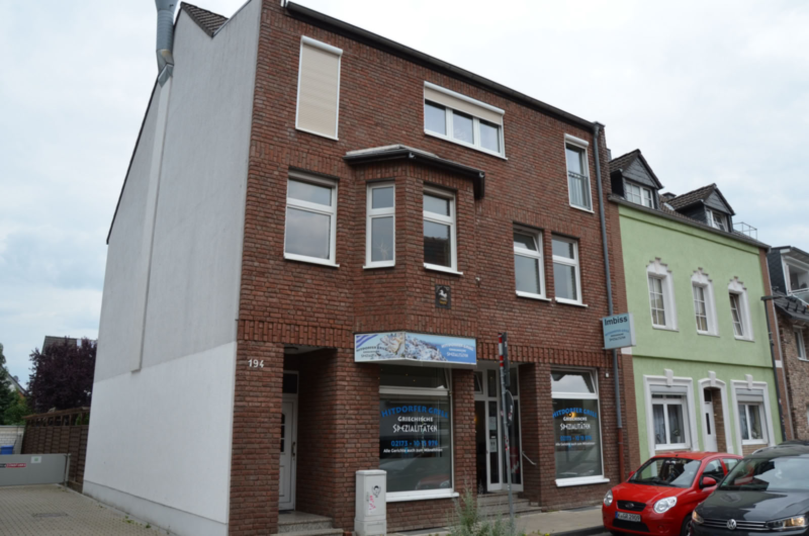 Auf der linken Strassenseiten kommen wir jetzt an das Haus des Klemptnermeisters Rommers. Später führte dort die Familie Göbel ein Haushaltswarengeschäft. Heute befindet sich in diesem Haus der Hitdorfer Grill, ein Griechischer Schnellimbiss.