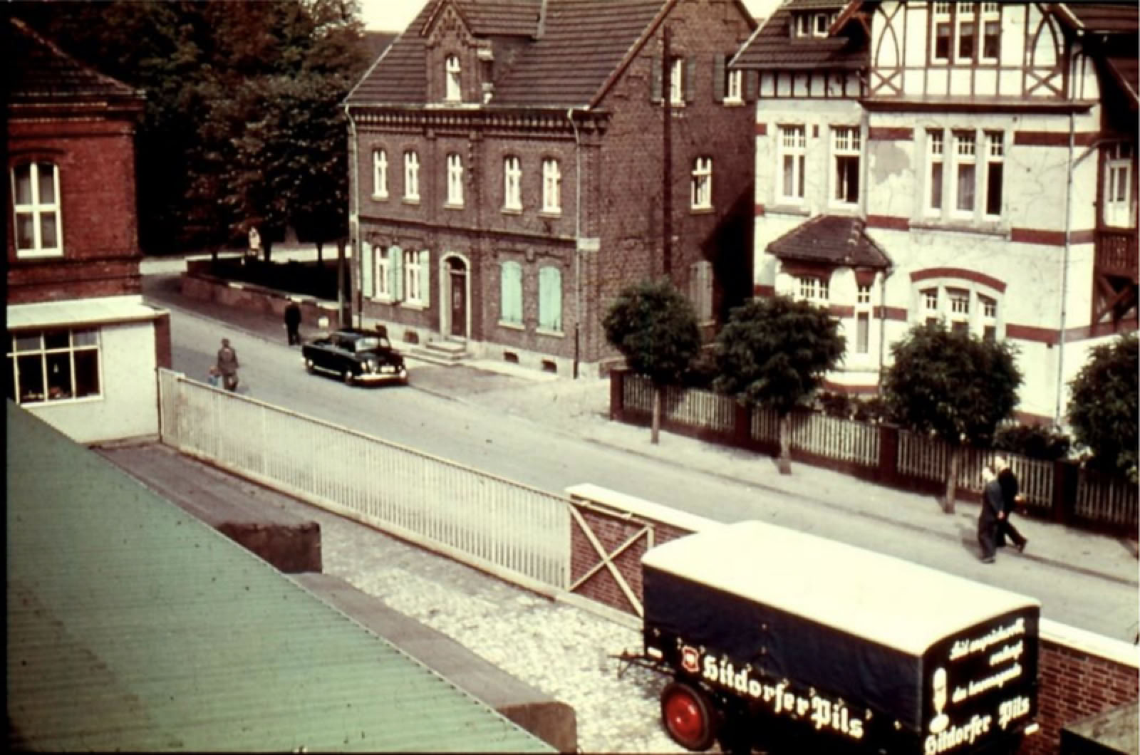 Blick aus der Hitdorfer Brauerei AG auf das Wohn- & Geschäftshaus und die Villa Freiburg um 1955