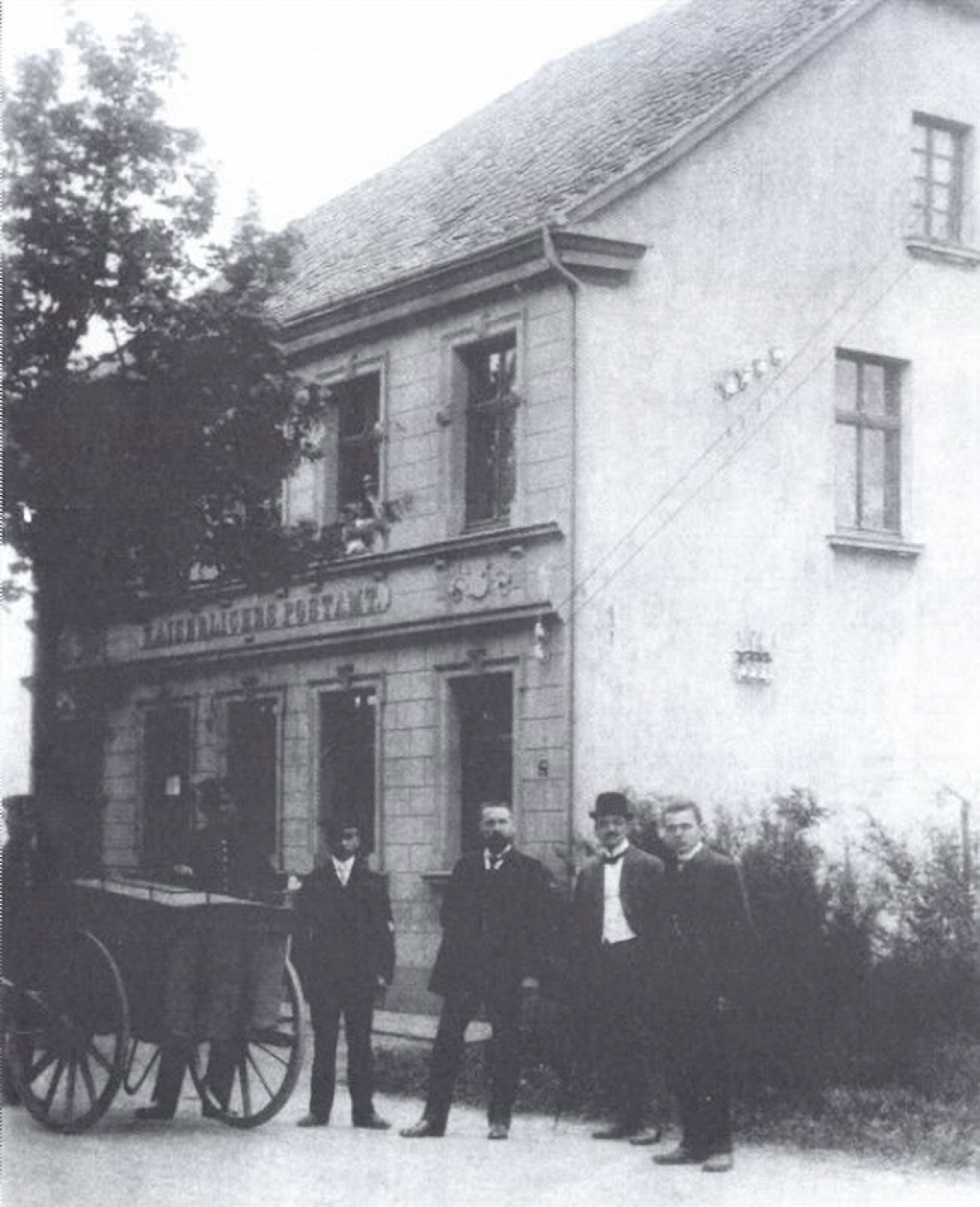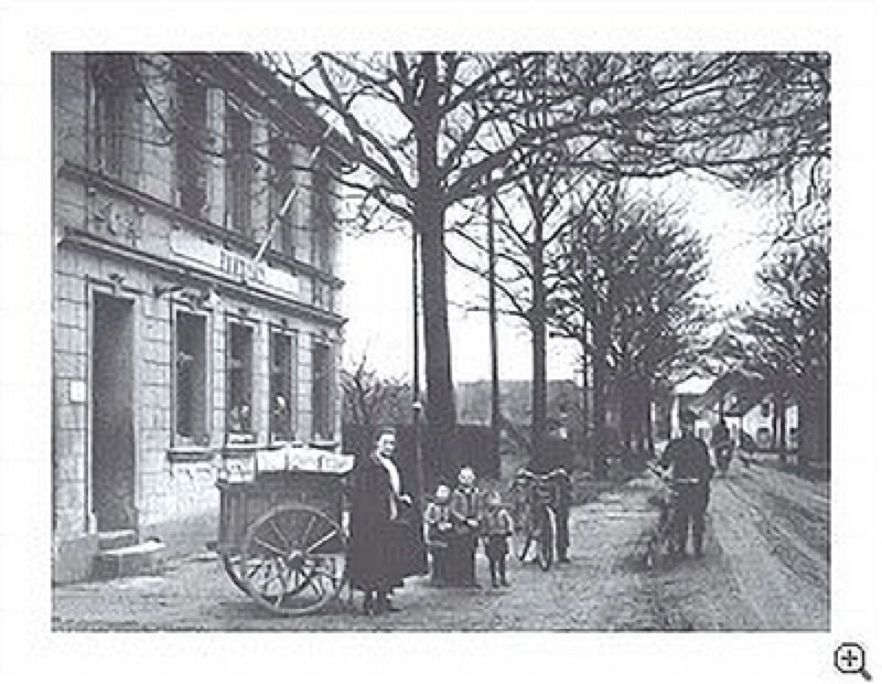 Das Kaiserliche Postamt an der „Chossie“, der Langenfelder Strasse. Die Postkutsche verkehrte zweimal zwischen Hitdorf und Langenfeld. Neben den Postsachen konnte die Kutsche bis zu 6 Personen befördern. Der Fahrpreis betrug um 1870 30 Pfennige. Ab der Haltestelle „Zur blauen Donau“, der einzigen Haltestelle auf der Strecke überhaupt, halbierte sich der Fahrpreis auf 15 Pfennige. Mit dem Anschluss an die Kleinbahnstrecke nach Monheim / Langenfeld verlor die Postkutsche ihre Bedeutung und wurde letztendlich durch diese verdrängt.