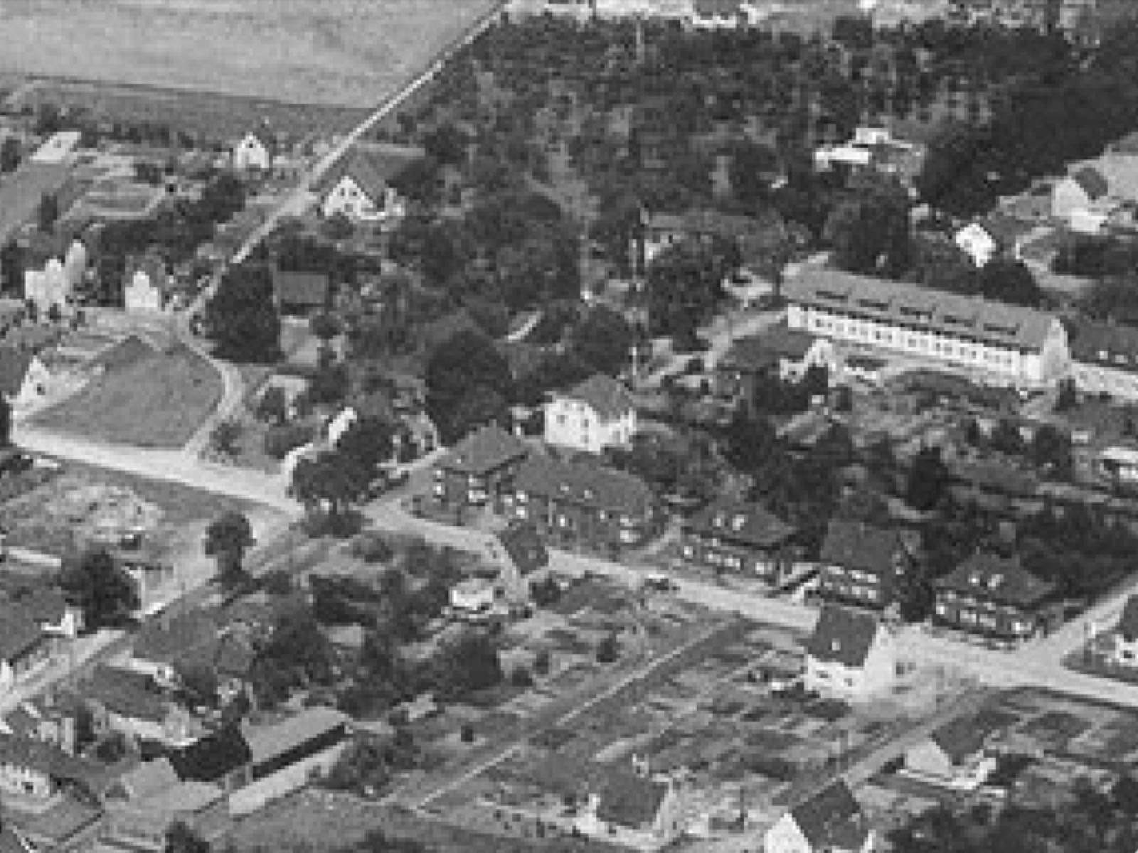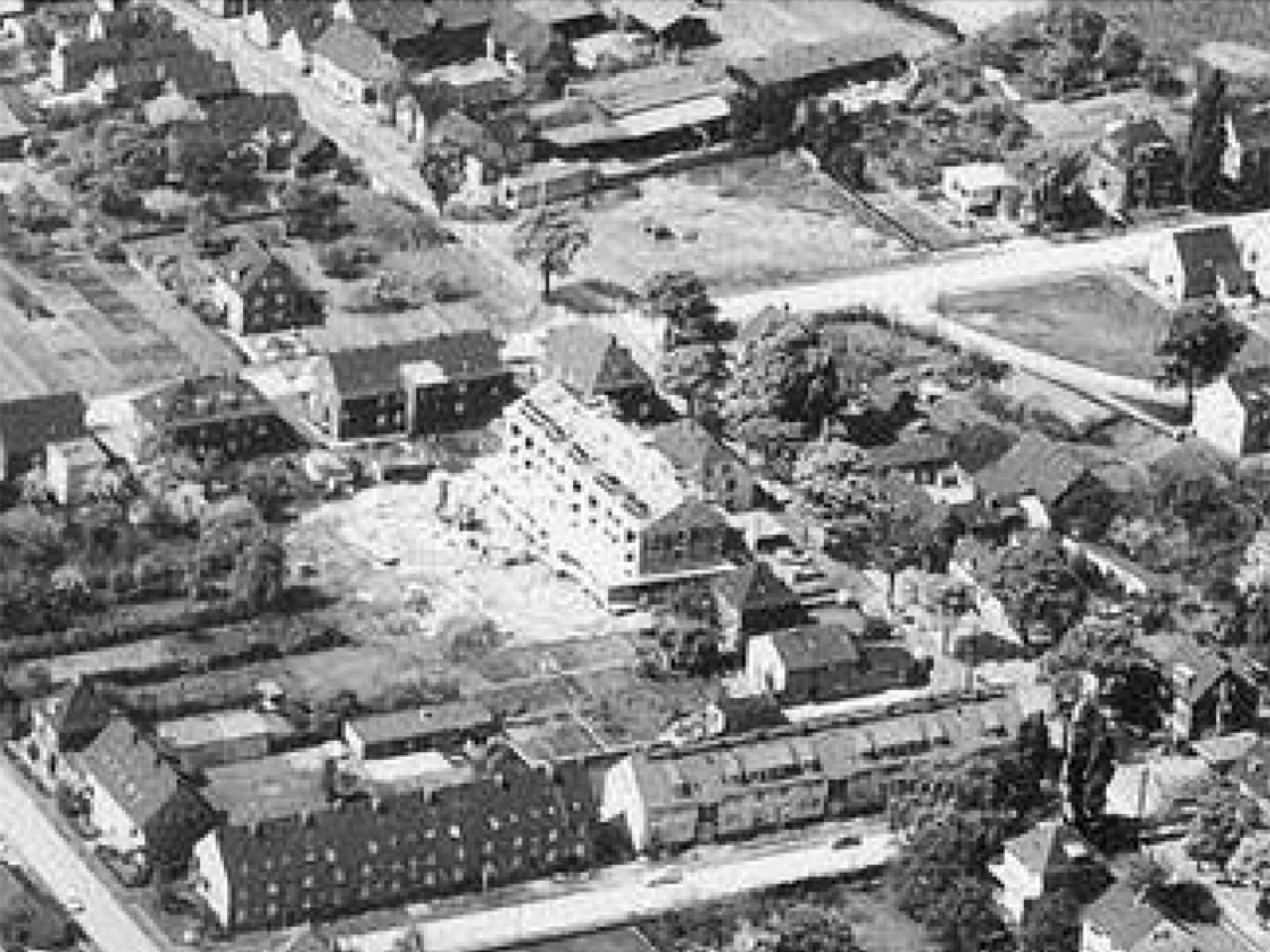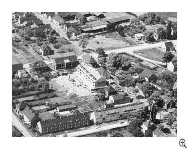 In der Bildmitte zu erkennen der Rohbau der neuen Verwaltung im Jahr 1961. Dem Neubau vorgelagert noch gut zu erkennen das alte Postamt.