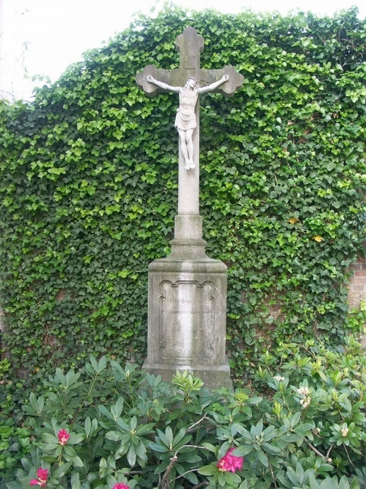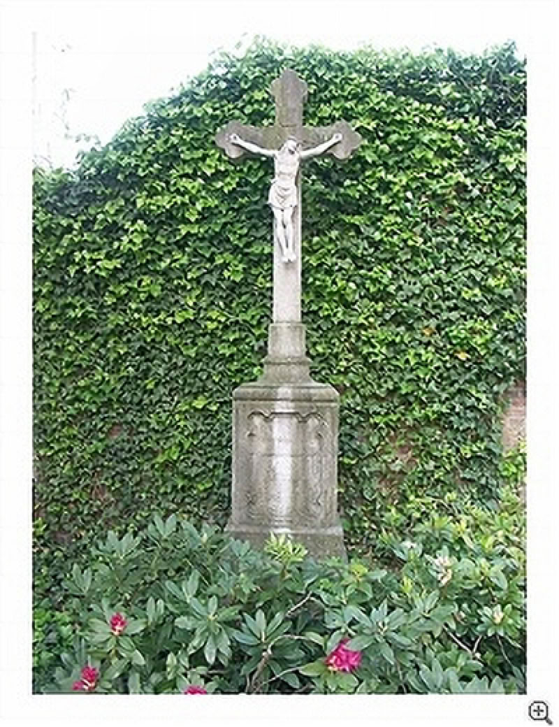 Das Kreuz ist ein Dreipass-Kreuz und zeigt im Sockel eine inzwischen stark verwitterte Abbildung der alten Kapelle von 1792. Bis nach dem Zweiten Weltkrieg stand es vor dem Hauptportal der Kirche und wurde dann neben das alte Pfarrhaus (Hitdorfer Strasse 153) versetzt. An die Stelle des Kreuzes vor dem Hauptportal wurde die Gedenkplatte angebracht.