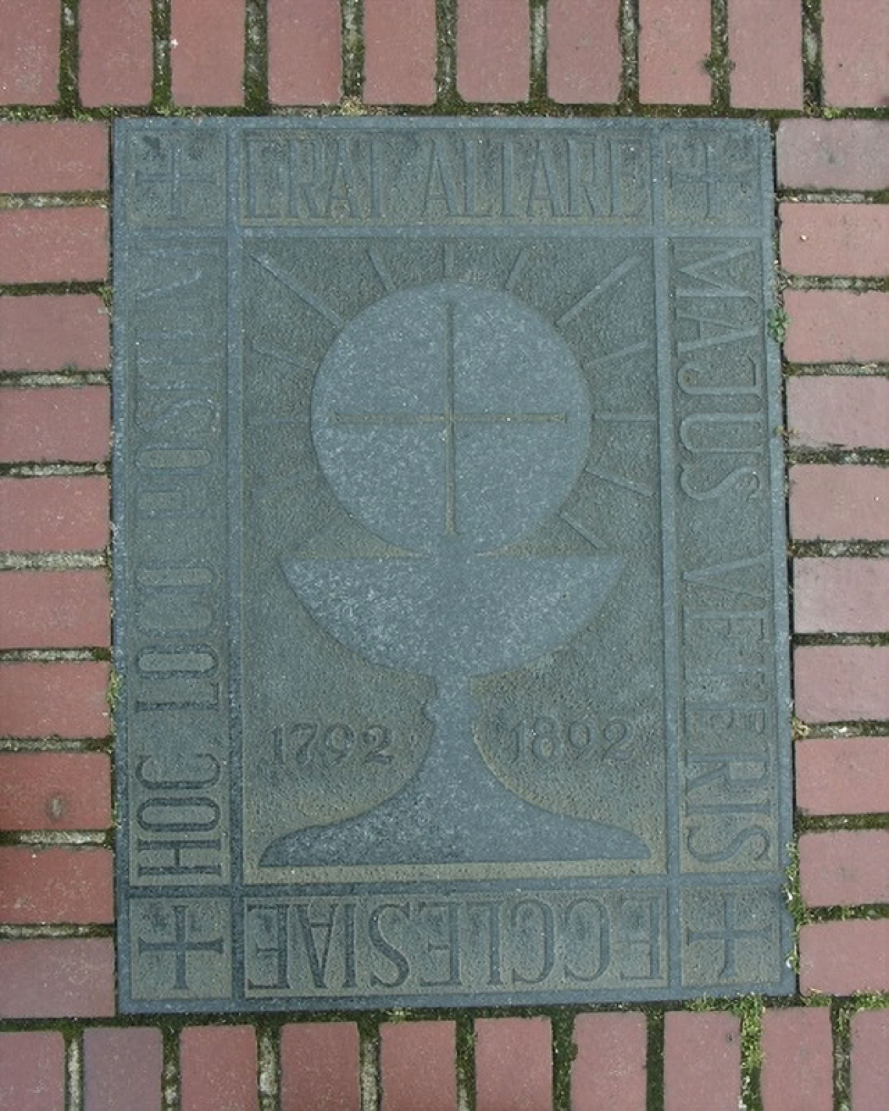 Die Gedenkplatte vor dem Hauptportal der St. Stephanus Kirche. Auf der Platte steht auf Latein geschrieben: