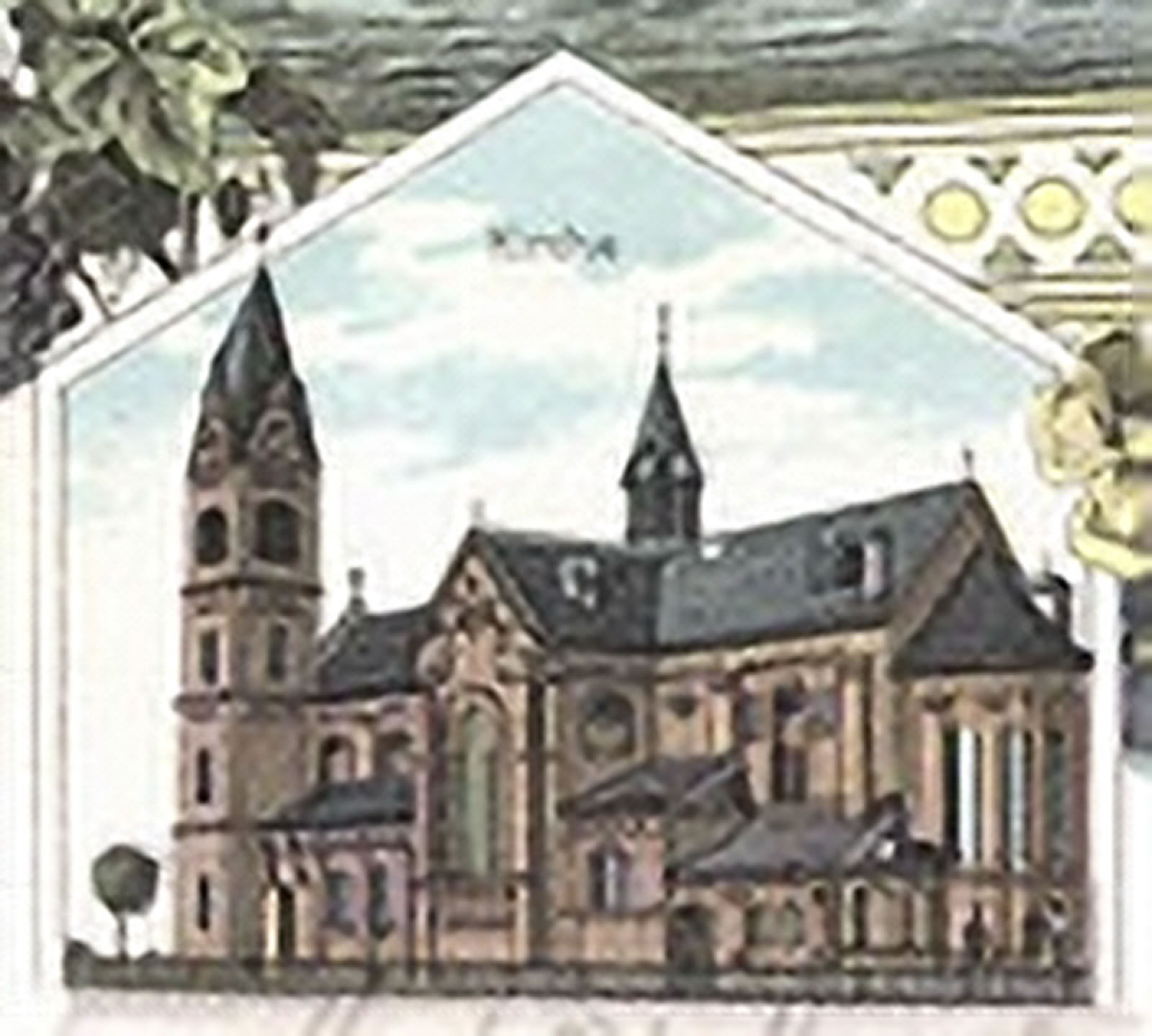 Diese alte Illustration einer alten Ansichtskarte zeigt die St. Stephanus Kirche ohne den Nordturm (Uhr). Dafür zeigt sich aber, dass die Kirche mal über ein Vierungsturm verfügte.
