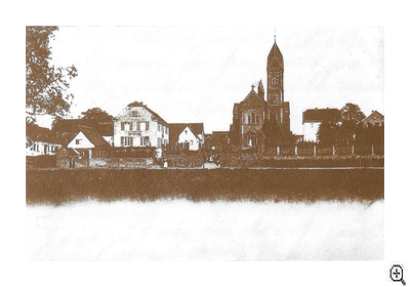Diese Aufnahme von 1888 zeigt die St. Stephanus Kirche nur mit dem zuerst alleine gebauten südlichen Turm. Links am Kirchturm vorbei geschaut, erkennt man das Vierungstürmchen, dass wohl im 2. Weltkrieg zerstört wurde und in der Nachkriegszeit bei der Restauration nicht wieder mit aufgebaut wurde.