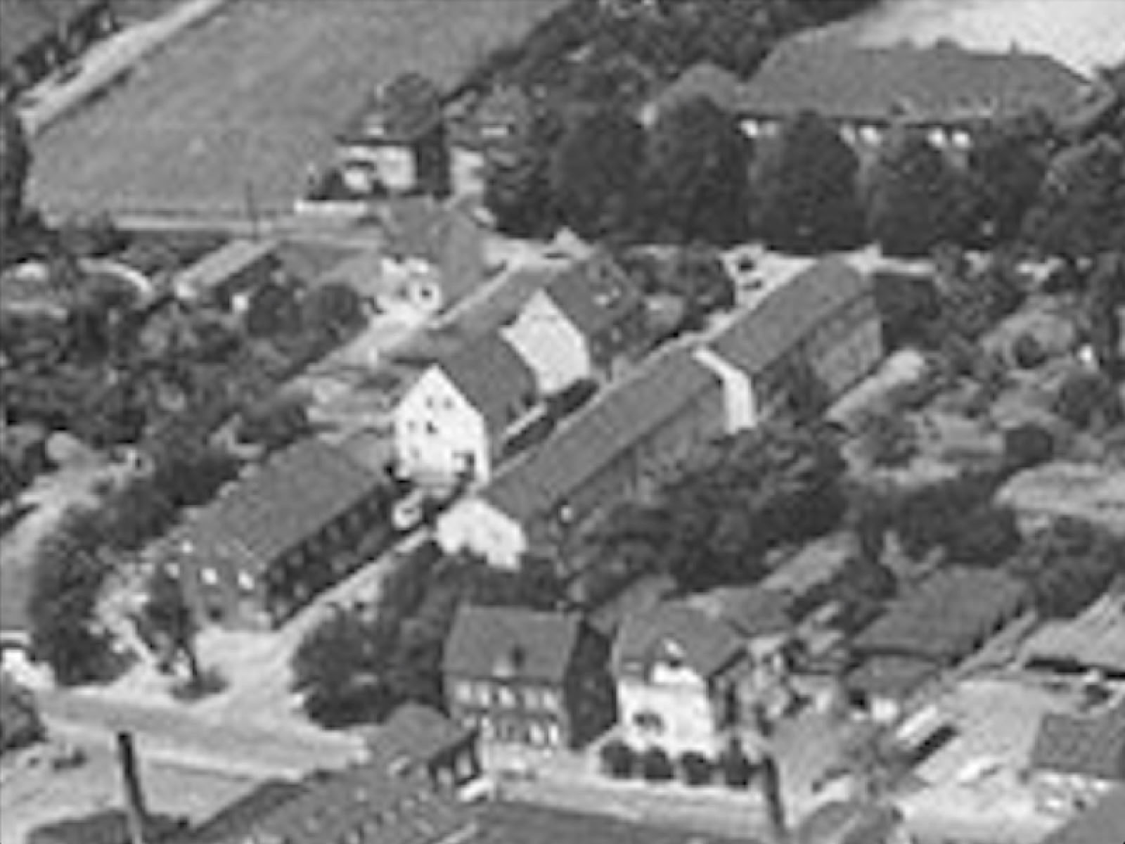 Links im Bild die 2. Hitdorfer Schule von 1843 an der Schulstrasse, der heutigen Parkstrasse um 1955