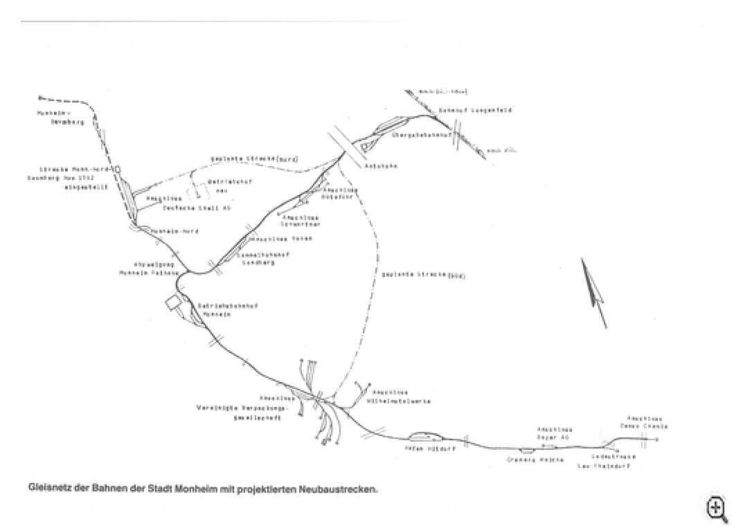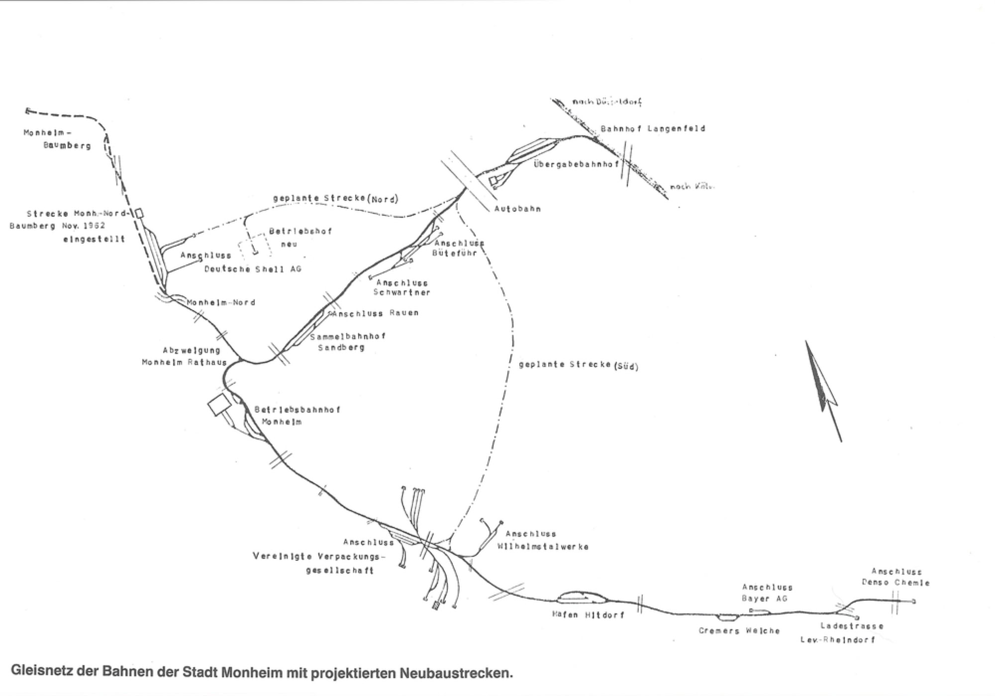 Das Gleisnetz der „Bahnen der Stadt Monheim“ aus dem Jahr 1962
