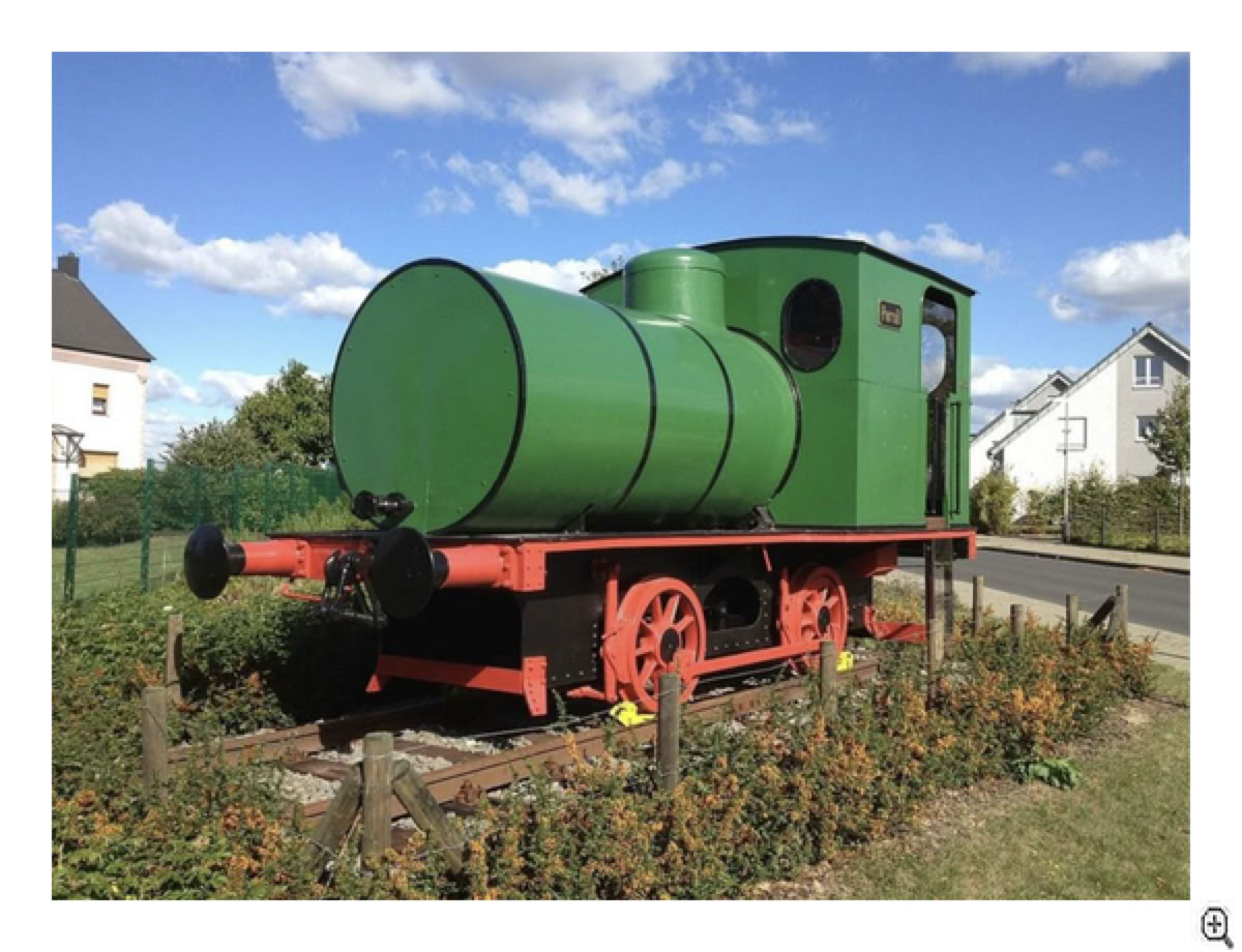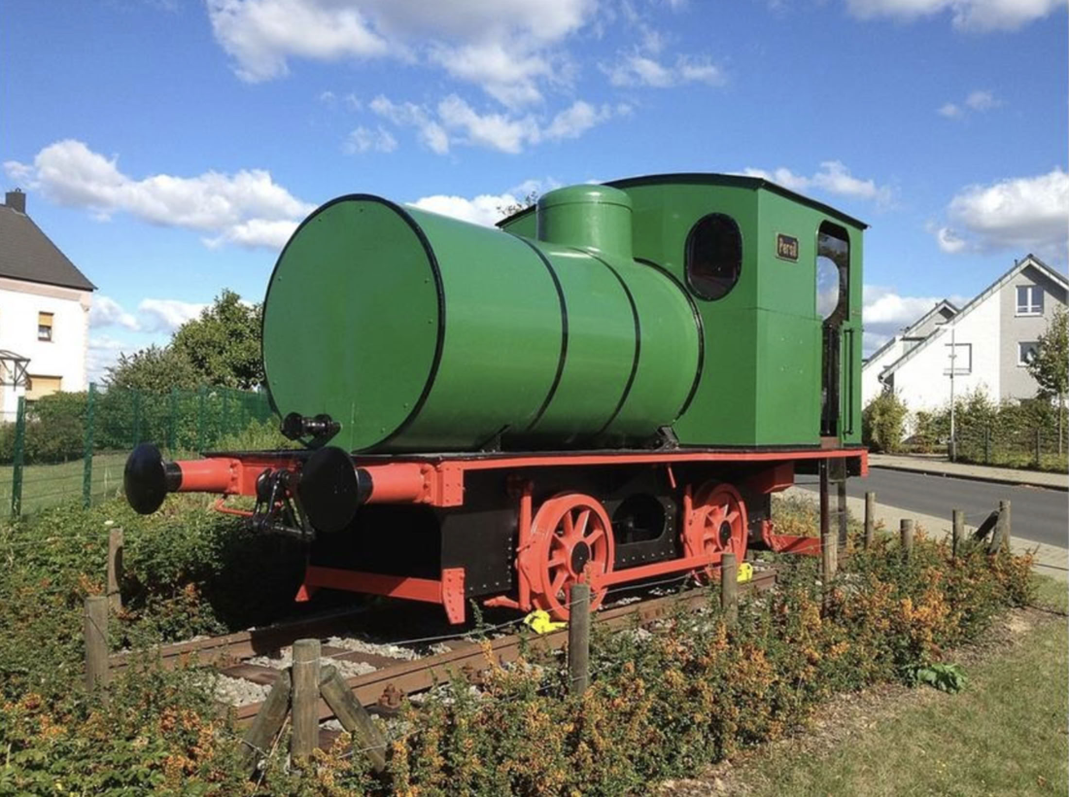 Die Dampfspeicherlok „PERSIL“ an ihrem heutigen Standort, dem nördlichen Hitdorfer Ortsausgang, am Kreisel Hitdorfer Strasse / Ringstrasse, an dem sie 2015 nach vollständiger Restaurierung neu aufgestellt wurde.