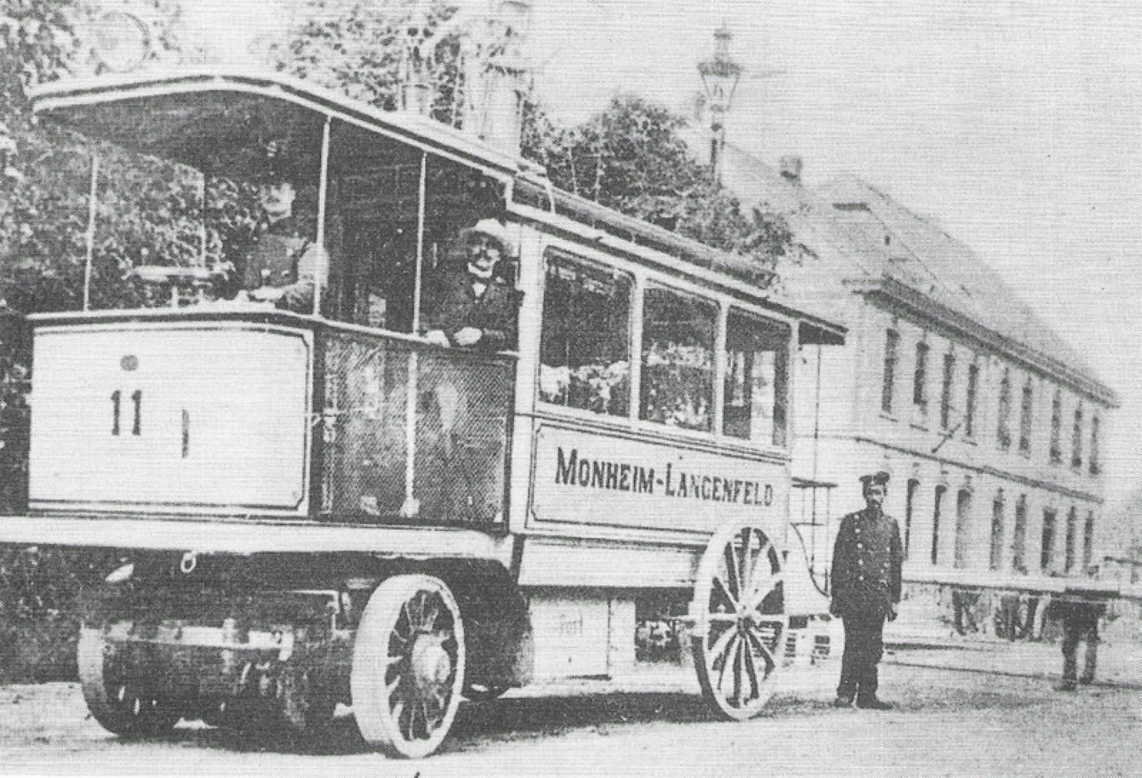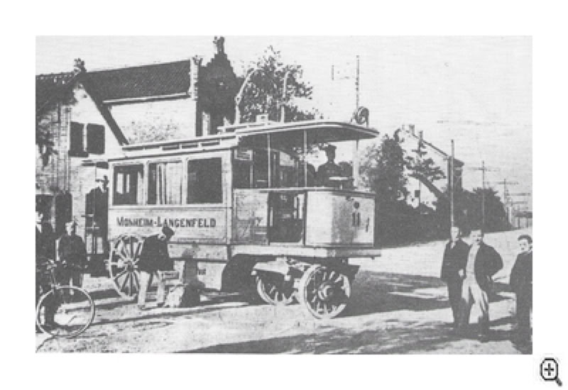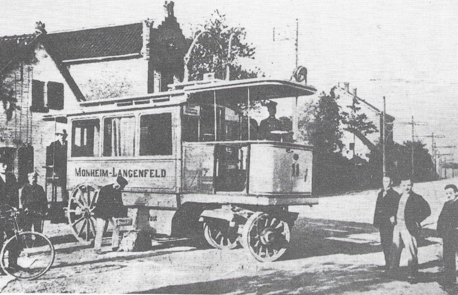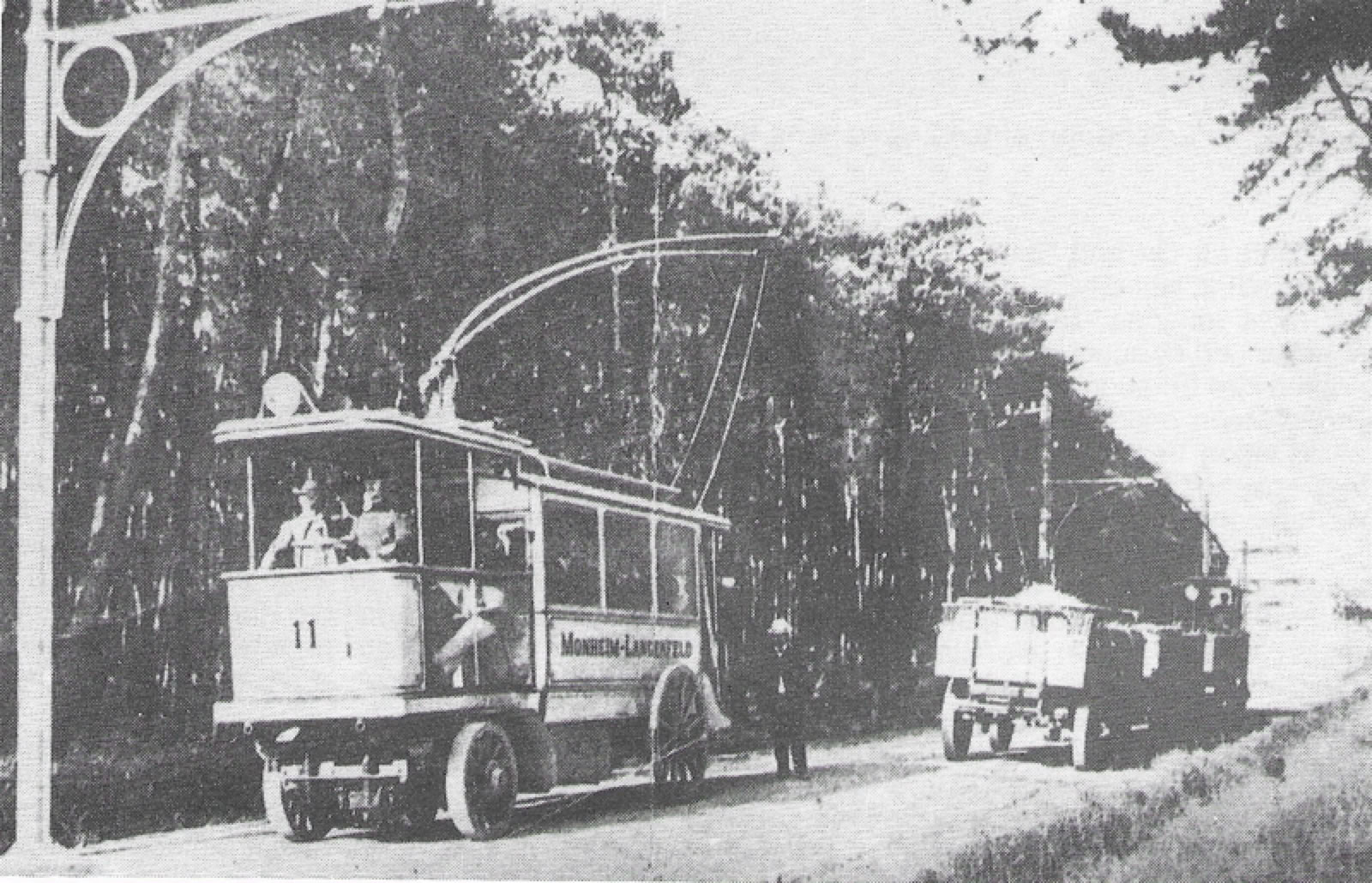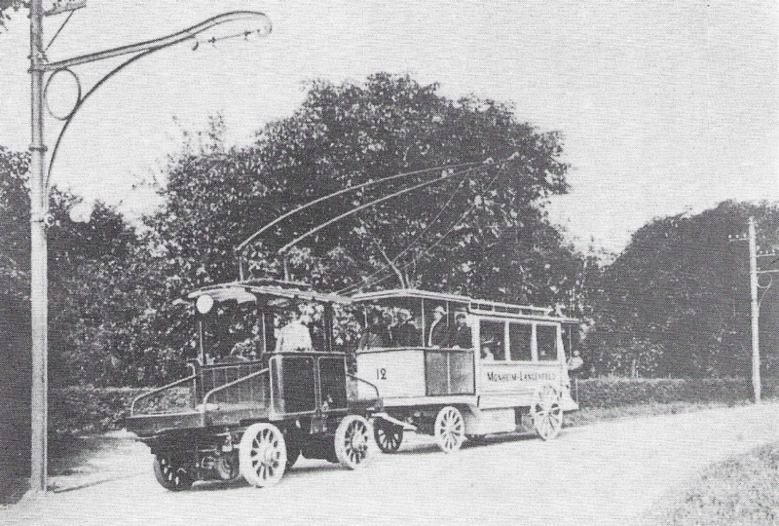 Die Gleislose elektrische Kleinbahn der Stadt Monheim um 1903. Ein Zugwagen mit Personenanhänger auf der Langenfelder Strasse in Richtung Monheim fahrend.