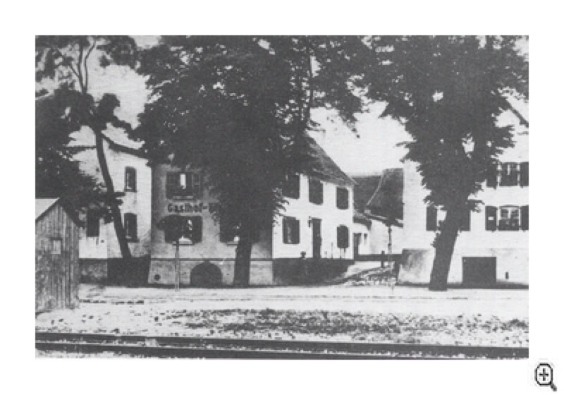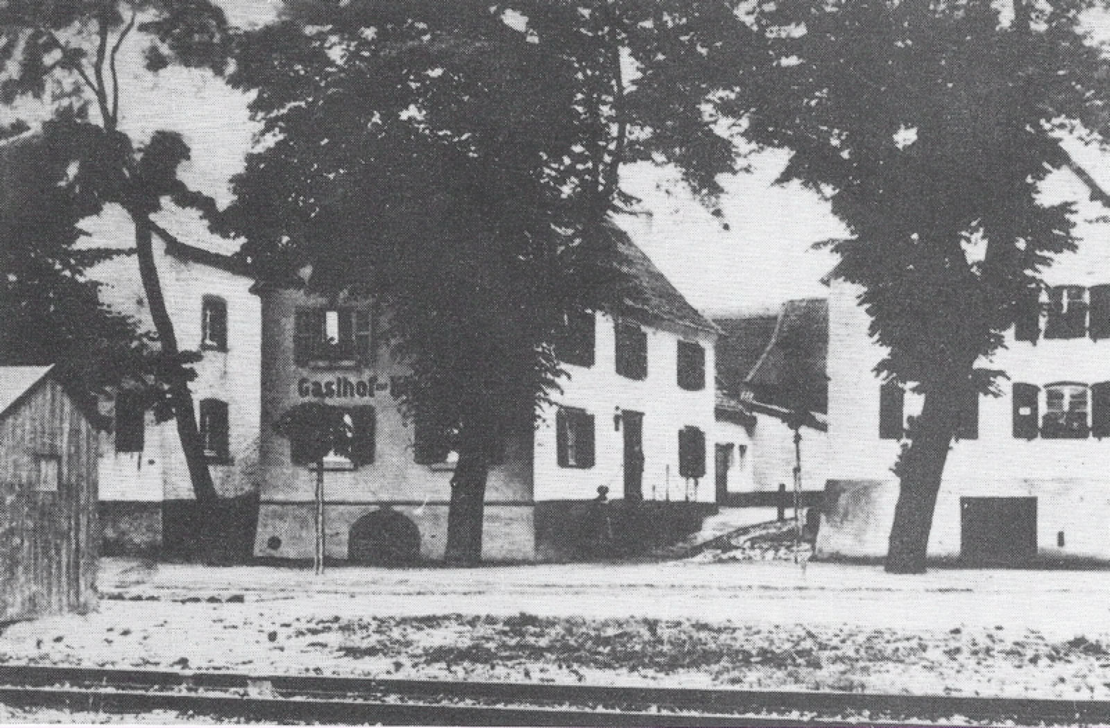 Der Gasthof zur „Kleinbahn“, Inhaberin Chr. Welter an der Rheinstrasse um 1930. Links im Bild das Holzhäuschen ist das Wiegehäuschen der Fuhrwerkswaage die von der Wirtin des Gasthofes betreut wurde.