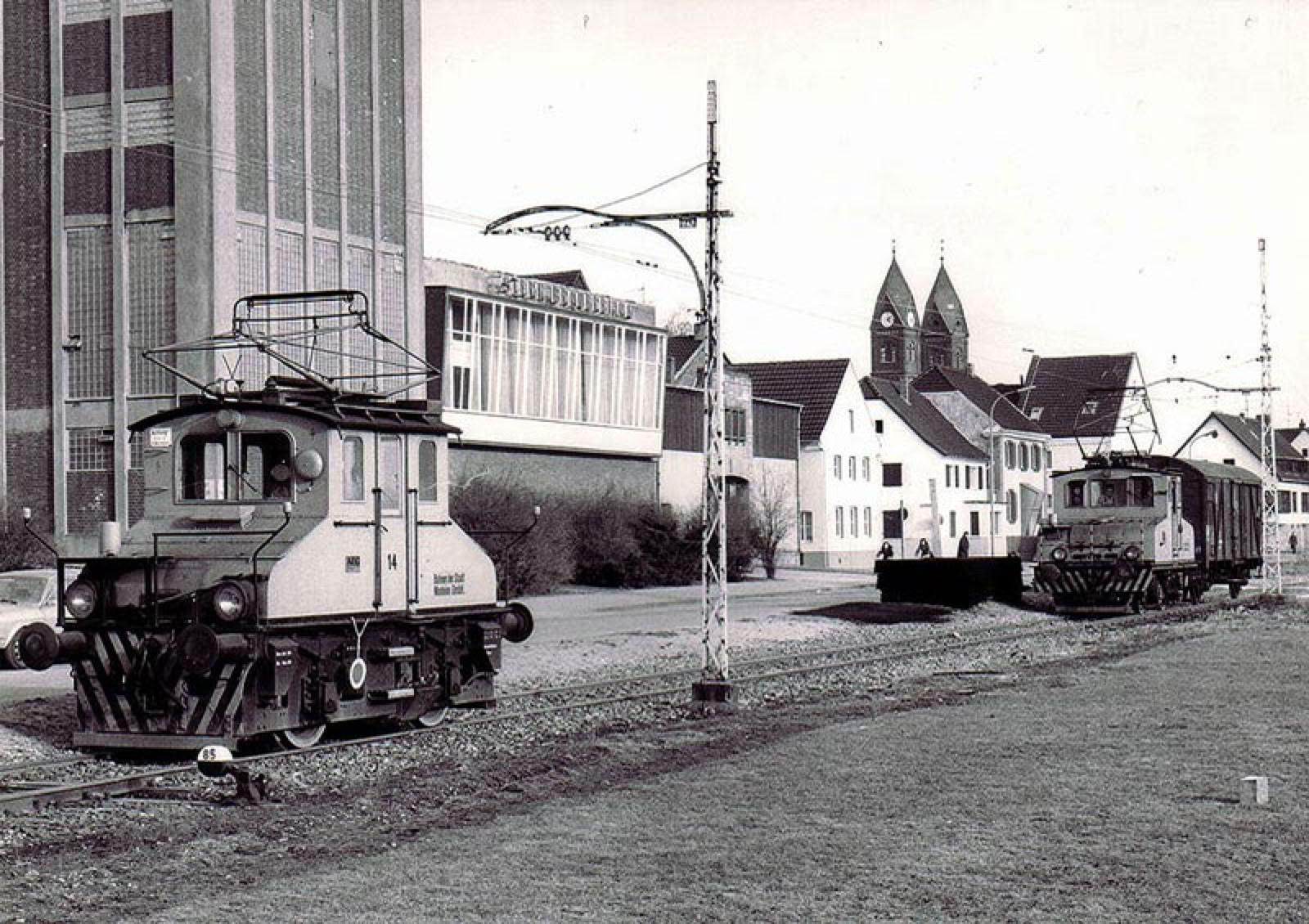 Die E-Lok 14 links & 15 rechts bei Rangierfahrten vor dem neuen Sudhaus der Hitdorfer Brauerei in den 1960er Jahren.