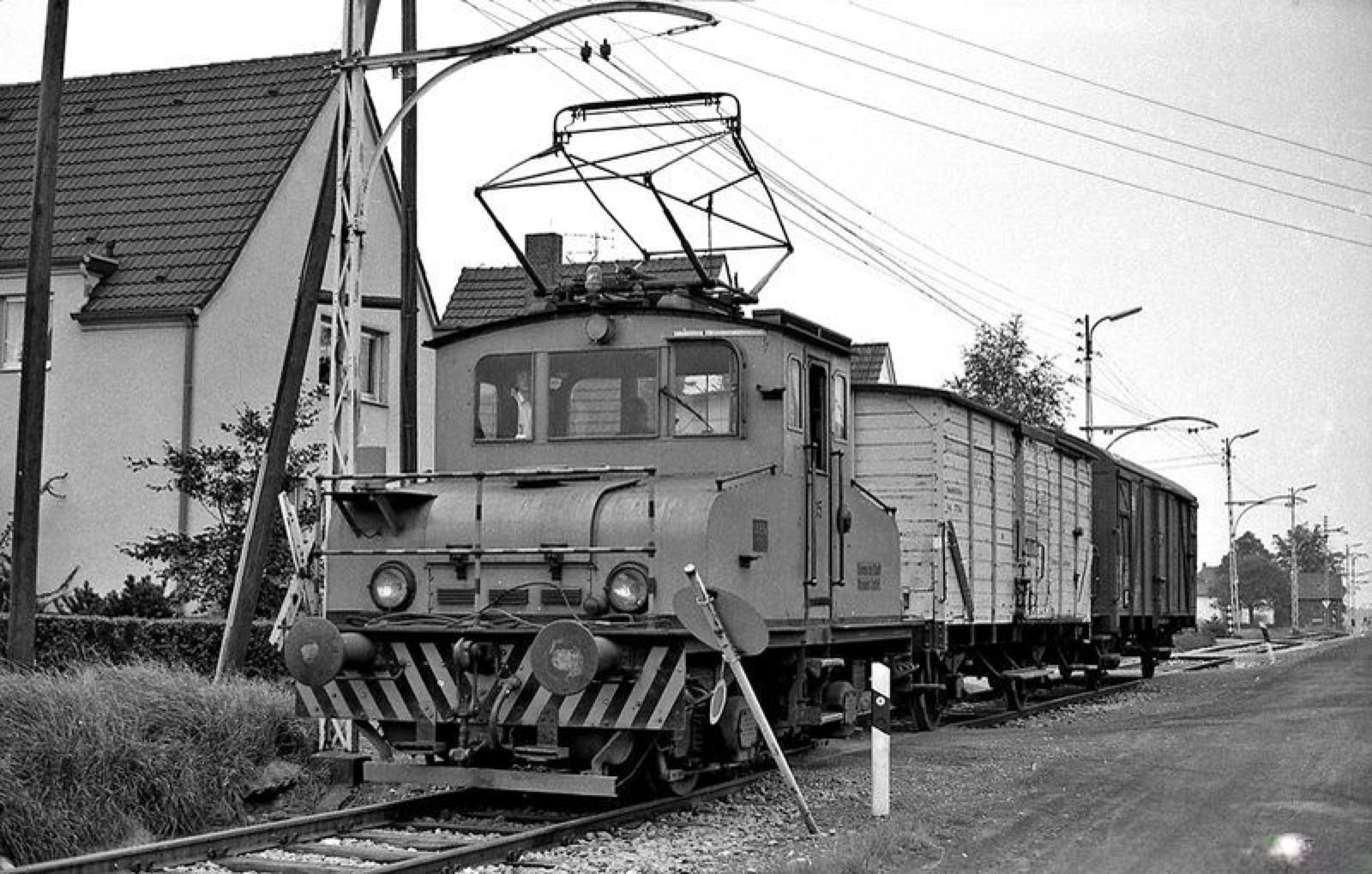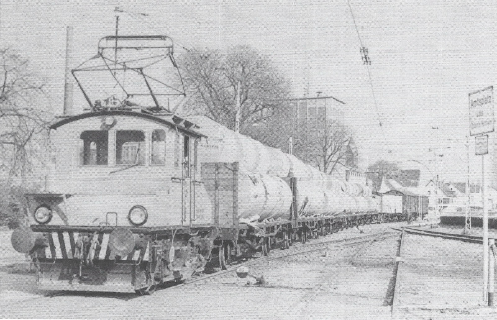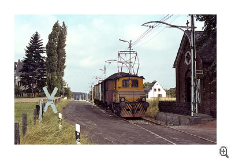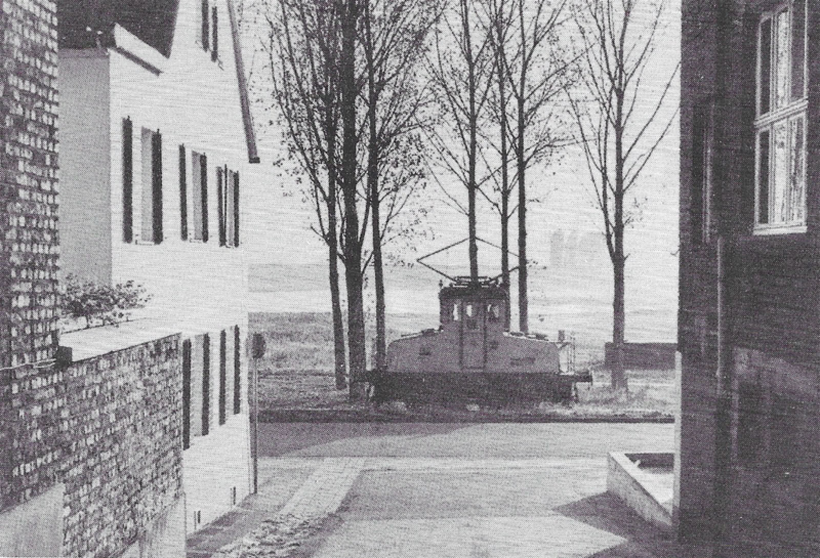 Die E-Lok 15 bei ihrer Einfahrt auf das „Lohr“ kurz nach der Überfahrt über die Hitdorfer Strasse in den 1970er Jahren.