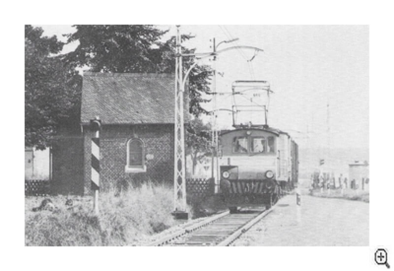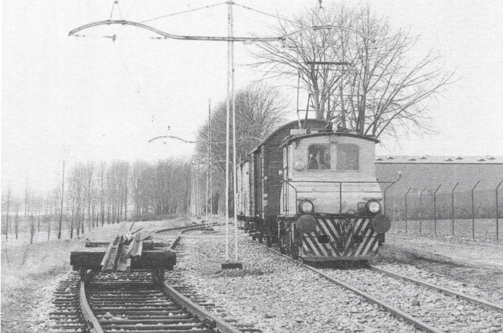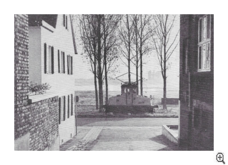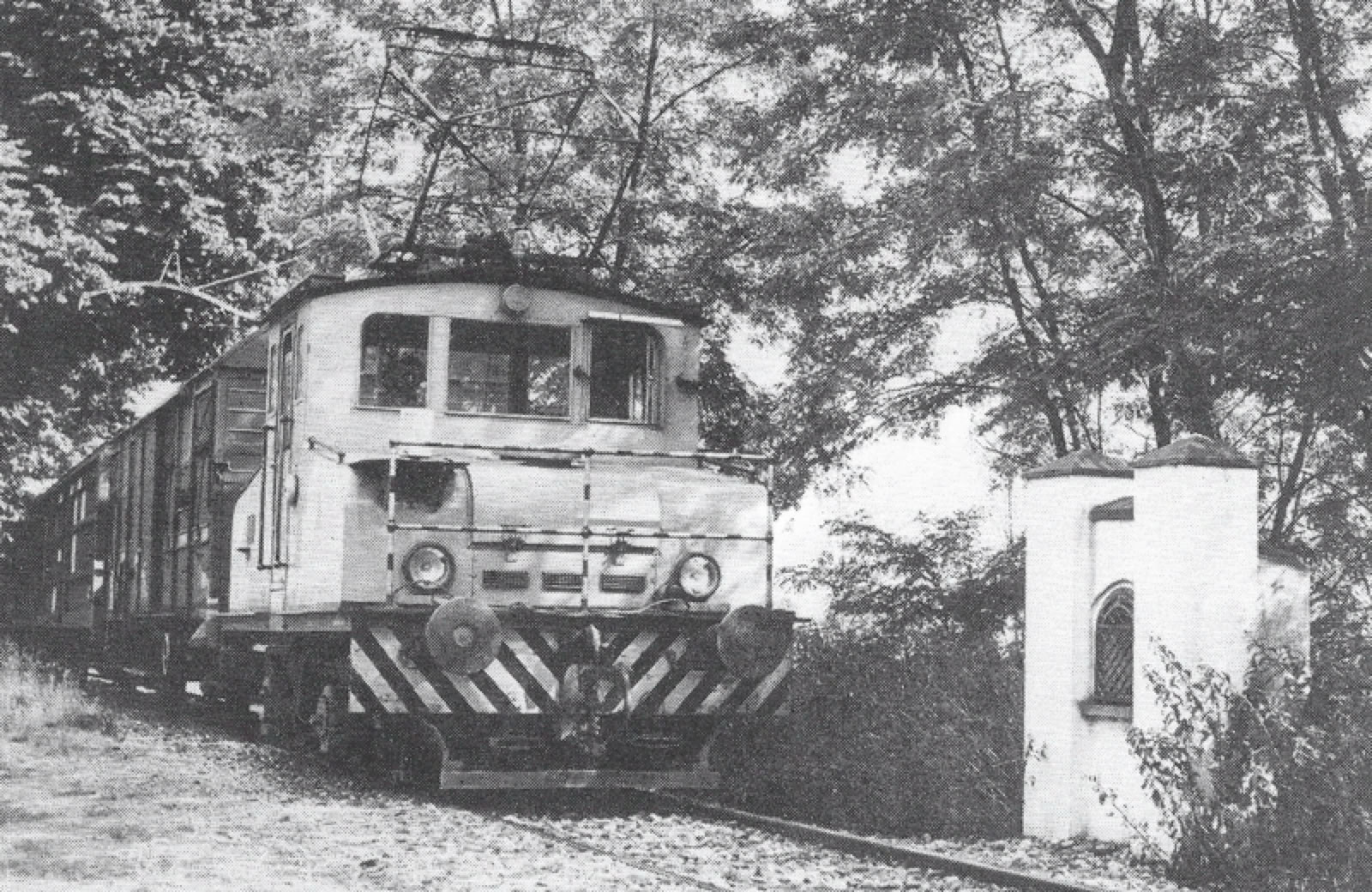 Die E-Lok 15 bei ihrer Einfahrt auf das „Lohr“ kurz nach der Überfahrt über die Hitdorfer Strasse in den 1970er Jahren.