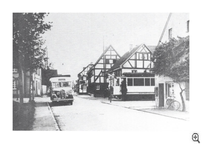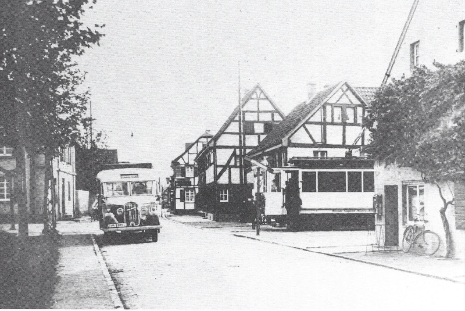 Die Strassenbahn an ihrer Endhaltestelle Felderstrasse in Rheindorf und links dem weiterfahrenden Omnibus nach Wiesdorf. Im Hintergrund das grosse Fachwerkhaus die Gaststätte Norhausen im Jahr 1934