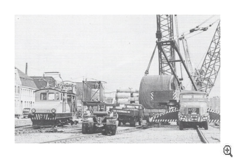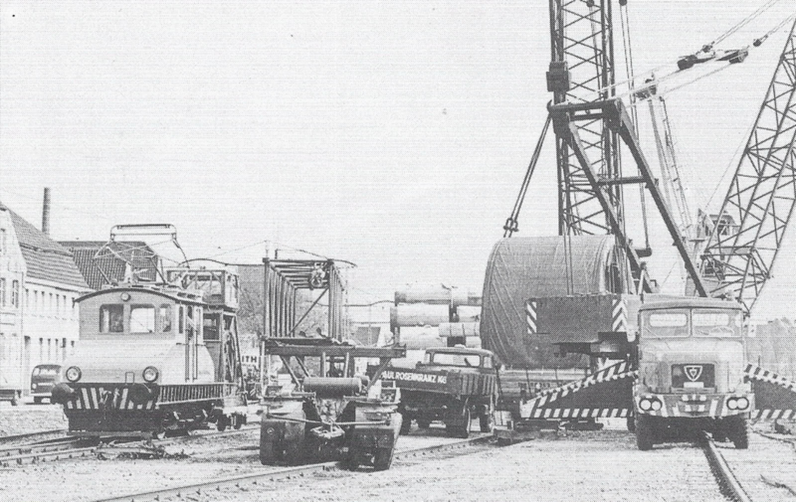 Schwertransport im Hitdorfer Hafen 1970. Schwerlastkräne verladen einen Trockenzylinder vom Schiff auf einen Tiefladewagen der Kleinbahn. Die E-Lok 1 steht mit einem Turmwagen für die Demontage der Oberleitung bereit.