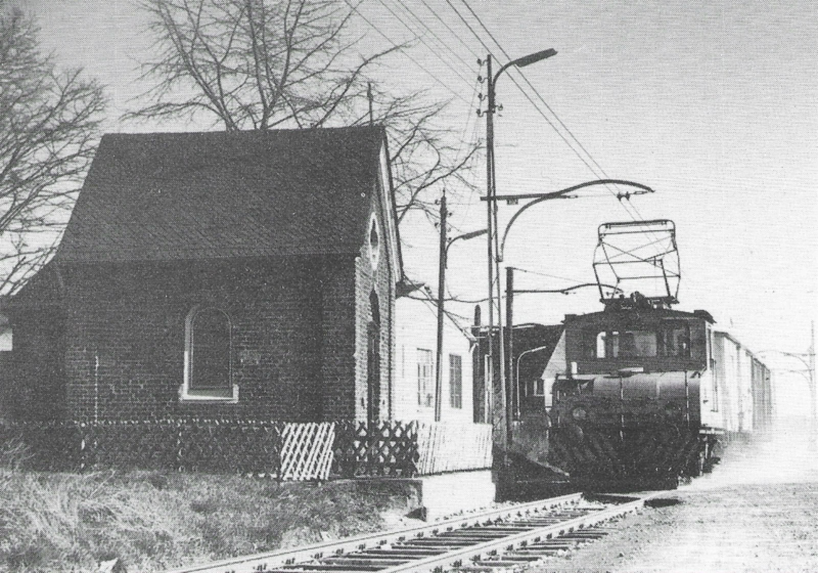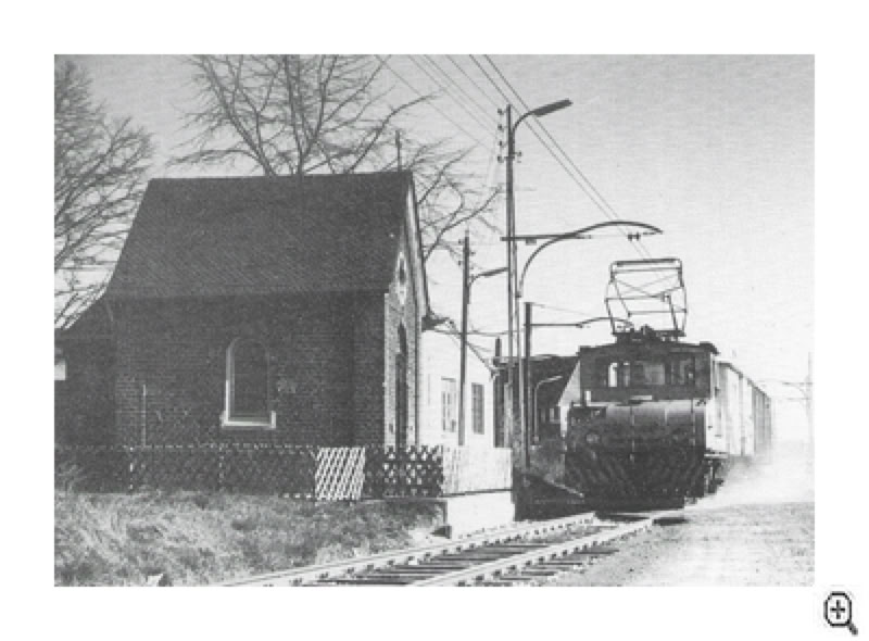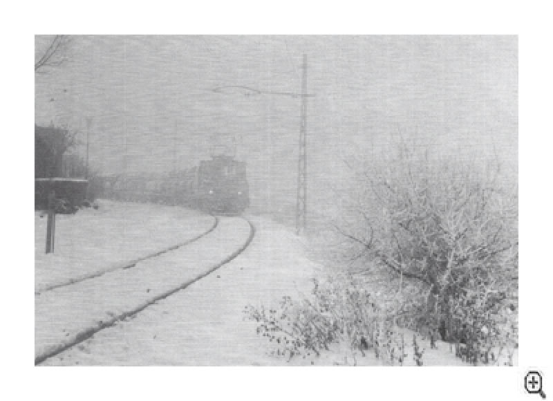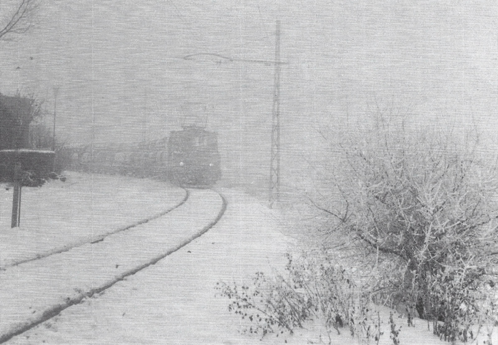 Die E-Lok 14 bei ihrer Ausfahrt vom „Lohr“ kurz vor der Überquerung der Hitdorfer Strasse an der Antonius-Kapelle im Januar 1979