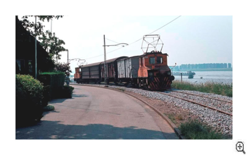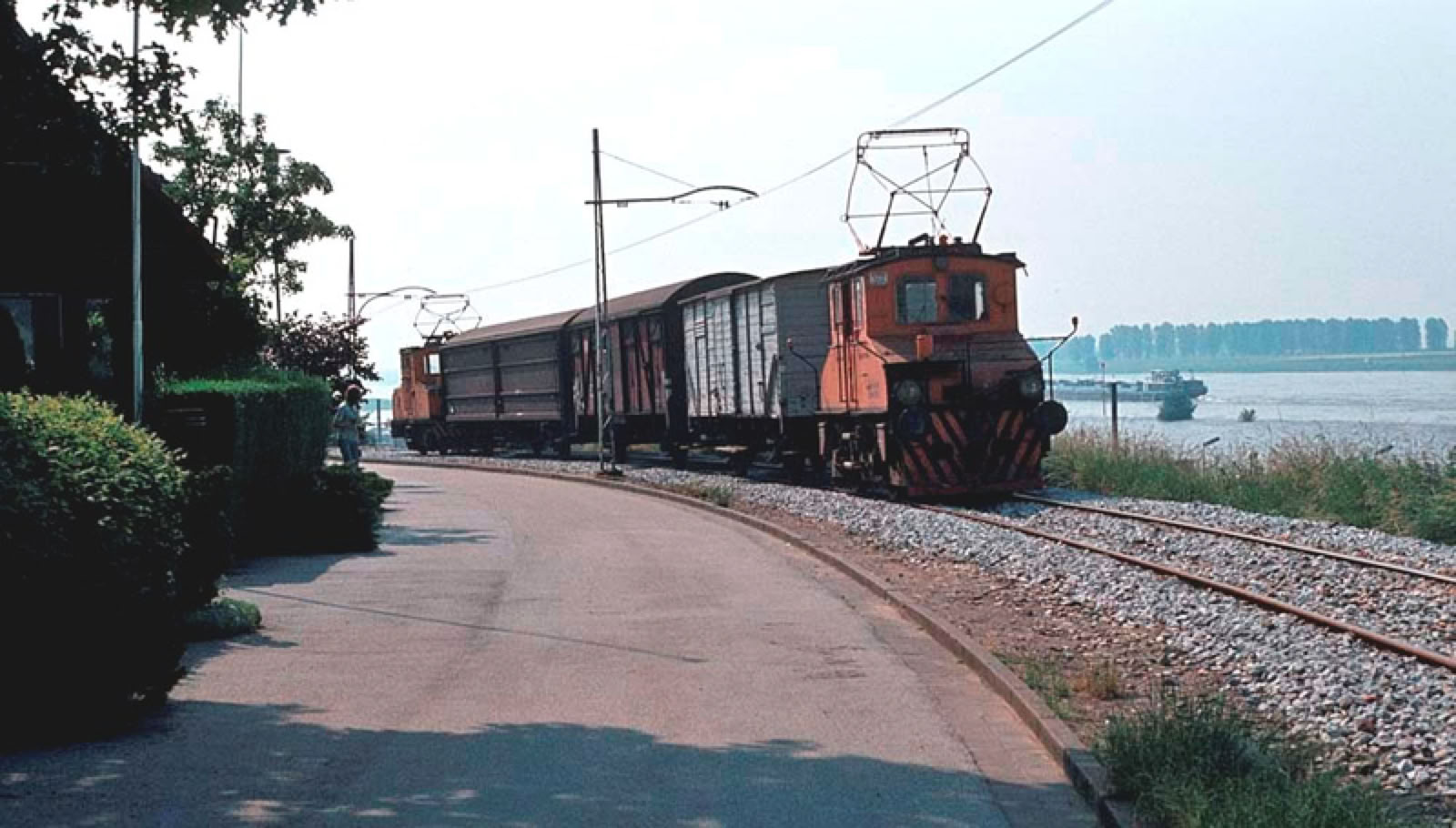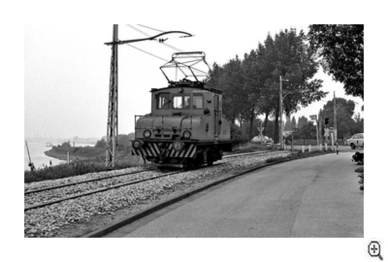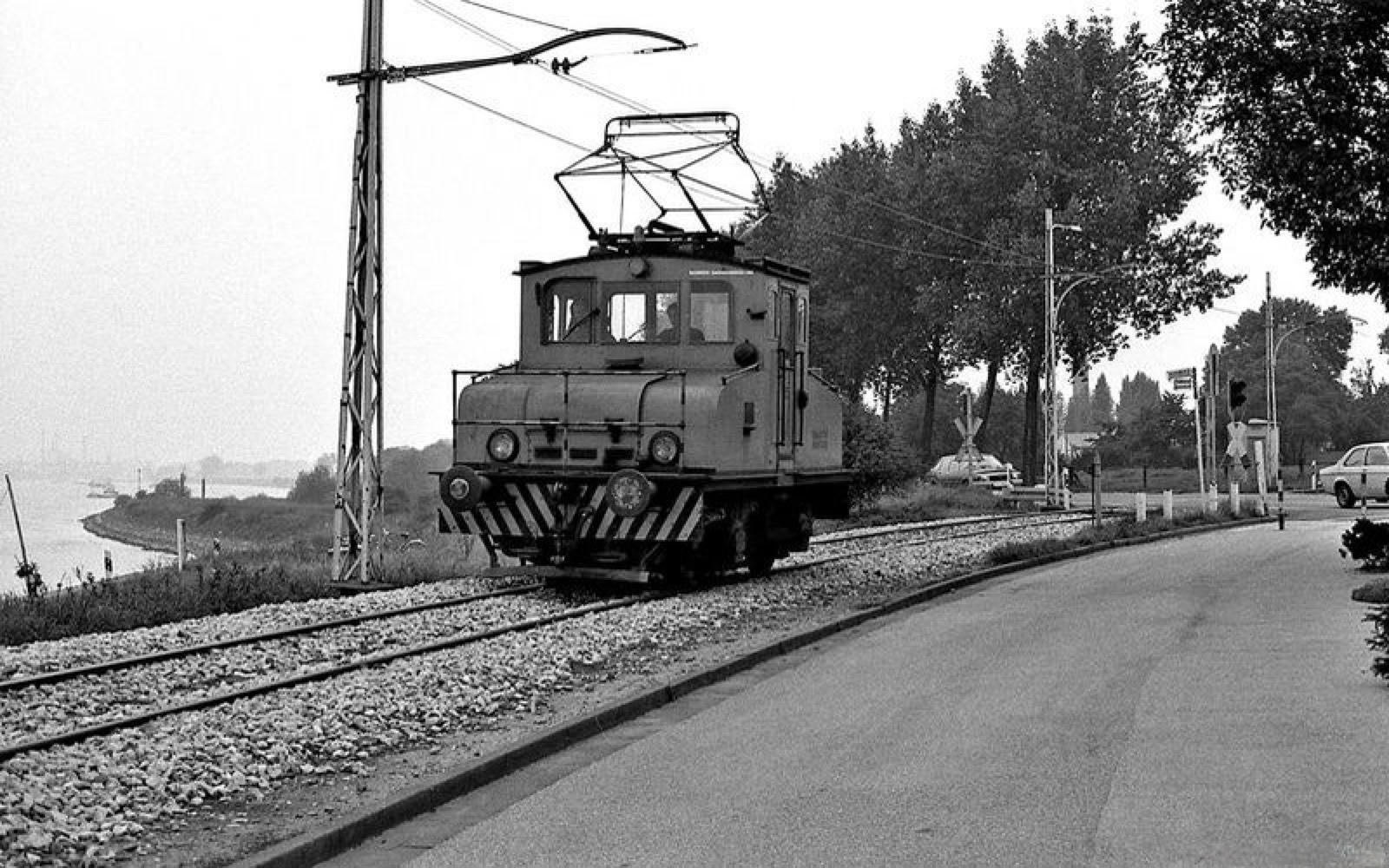 Die E-Lok 14, vorne & die E-Lok 15, hinten, bei der Fahrt an der Hitdorfer Rhein-Promenade an der „Caspers.Nees Villa“ in den 1970er Jahren
