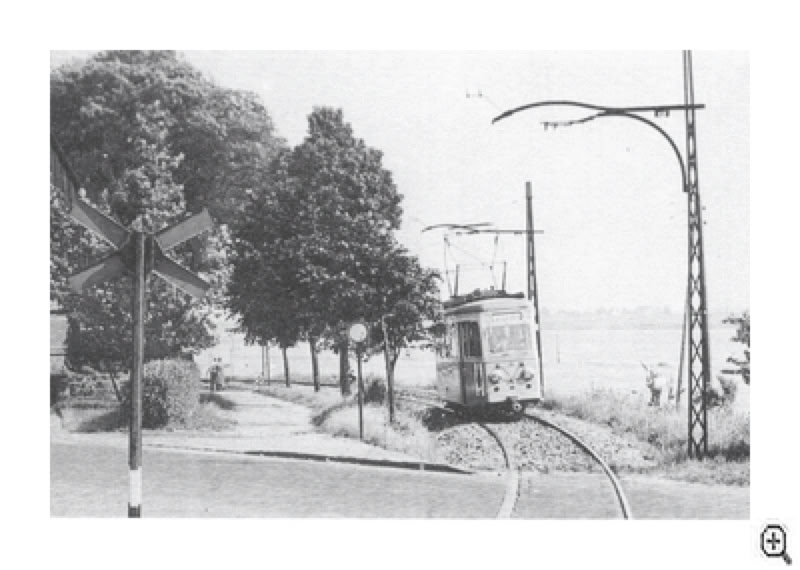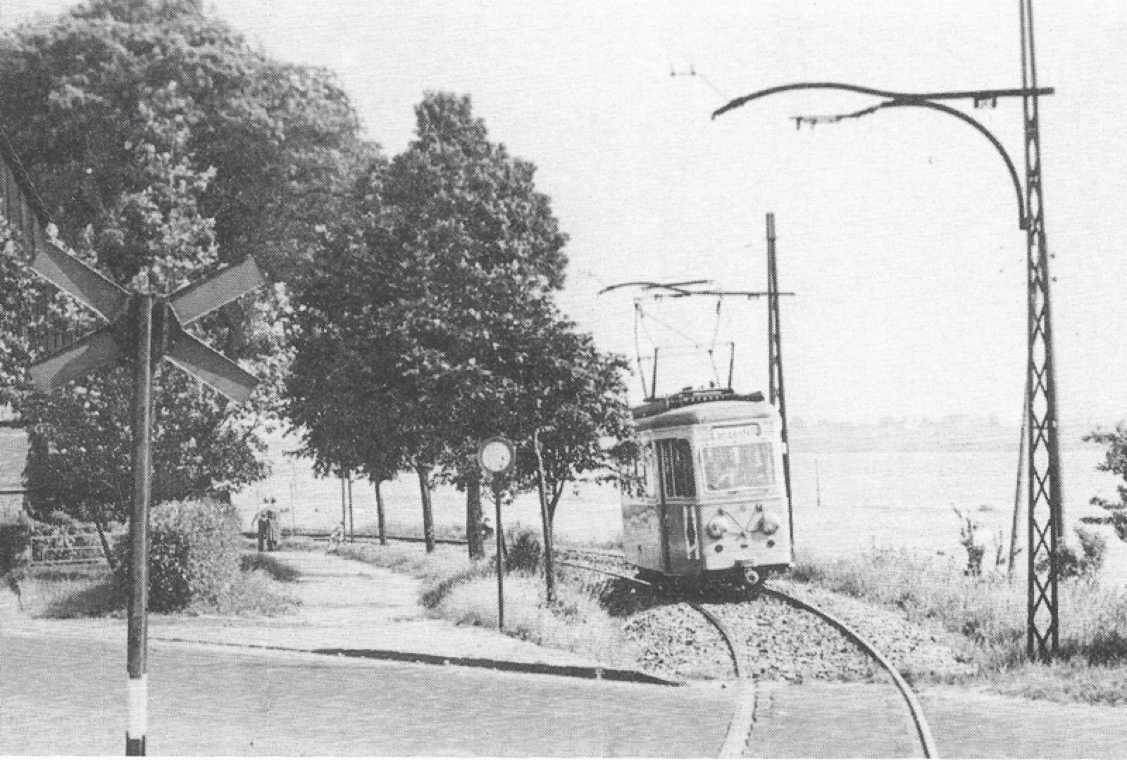 Der Triebwagen 6 der Strassenbahn bei der Ausfahrt aus der Rheinpromenade, dem „Hitdorfer Lohr“ kurz vor der querung der Hitdorfer Strasse im Juni 1955.