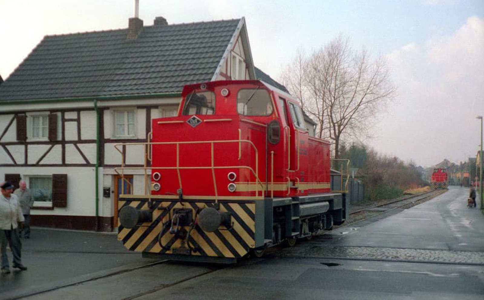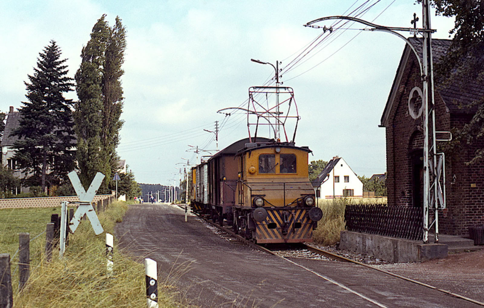 Die E-Lok 15 mit Güterwagons auf dem Hitdorfer Heerweg bei der Fahrt nach Monheim im Jahr 1979. Im Hintergrund die Antonius Kapelle