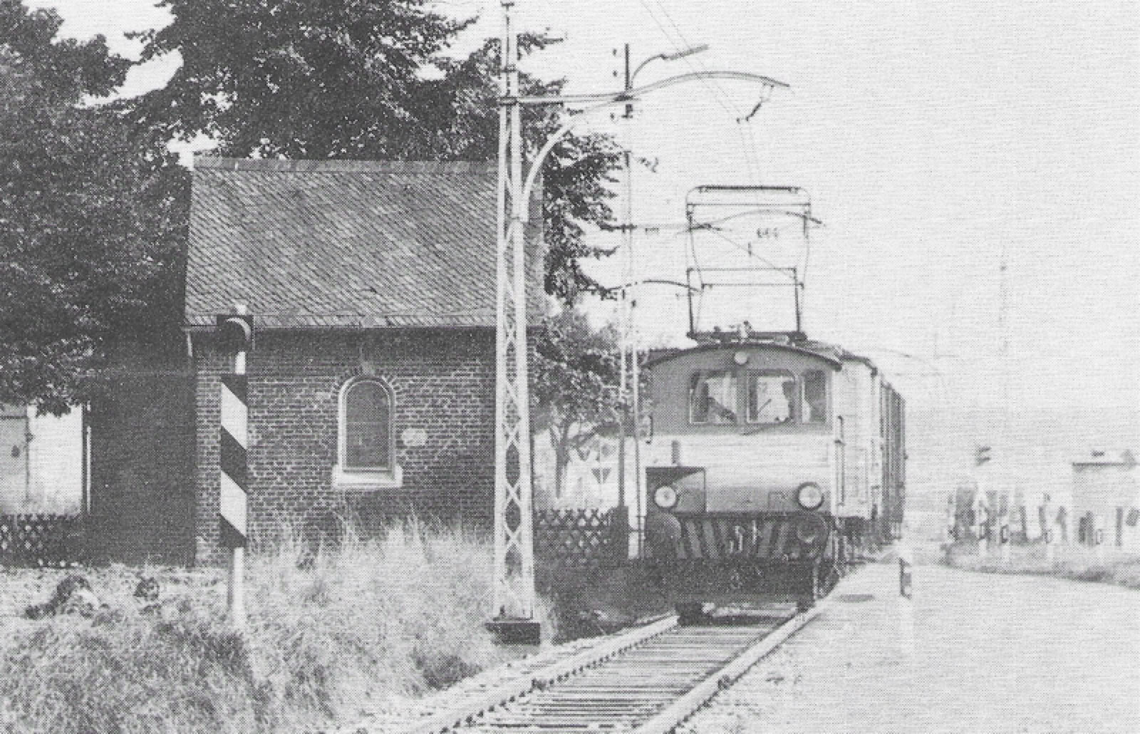 Die E-Lok 15 auf dem Hitdorfer Heerweg an der Antonius Kapelle im Februar 1978