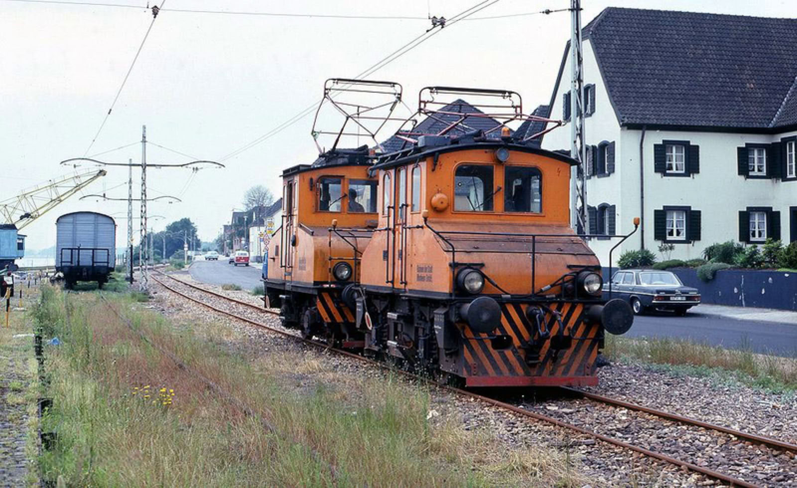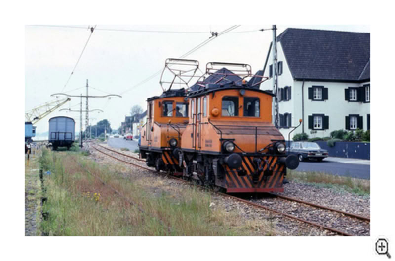 Die E-Lok´s 15 & 14 bei der Einfahrt aufs Hitdorfer „Lohr“ in Richtung Hafen in den 1970er Jahren