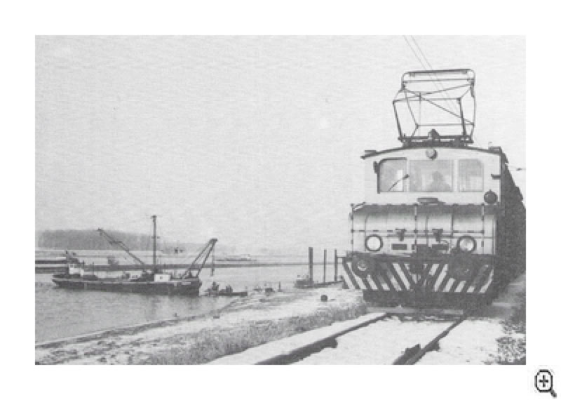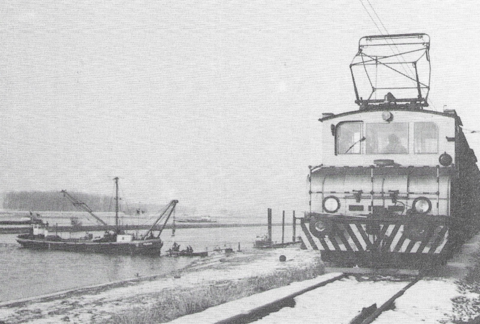 Blick auf die Hafeneinfahrt und die in den Hitdorfer Hafen einfahrende E-Lok 15 im Jahr 1974