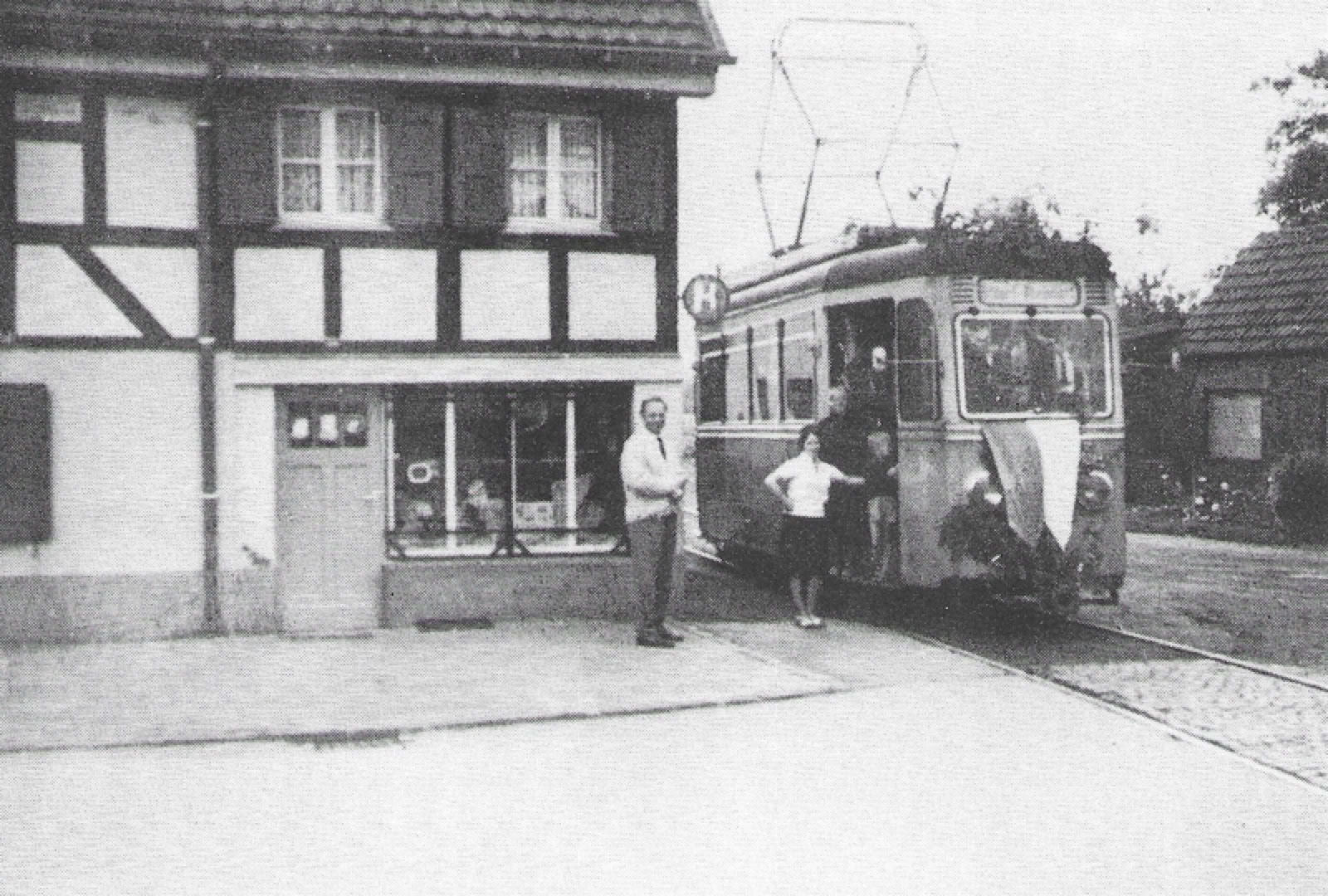 Die E-Lok 15 am Heiligenhäuschen auf der Wiesenstrasse in Hitdorf. Das Heiligenhäuschen diente auch als Haltestelle der Strassenbahn, im Juli 1976