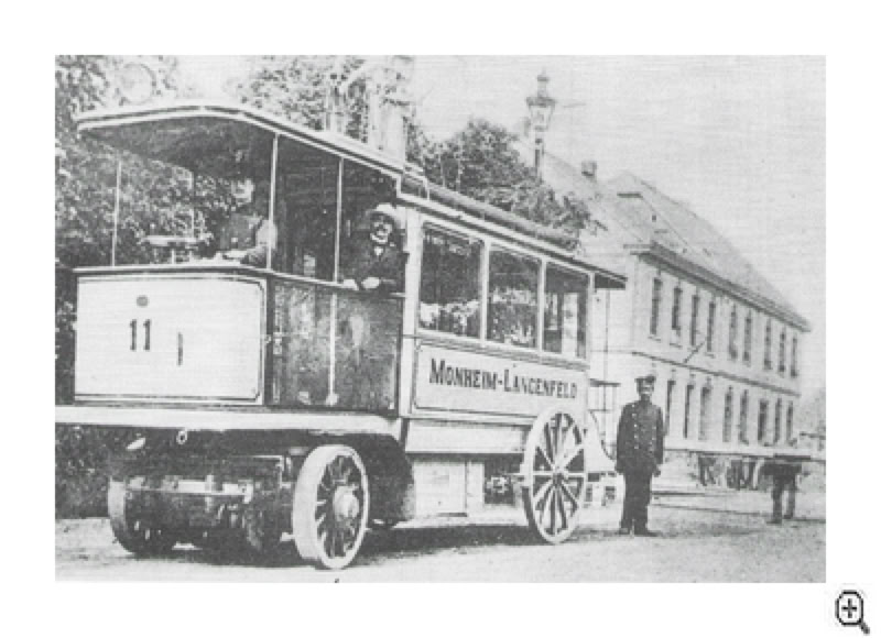 Der Motorwagen 11 der Gleislosen Kleinbahn an der Endhaltestelle Frohnstrasse in Monheim 1905