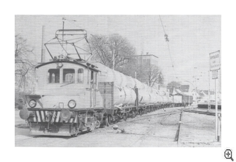 Die E-Lok 1 vor einer Fuhre Papierrollen für die Monheimer Pappenfabrik bei der Ausfahrt aus dem Hitdorfer Hafen im März 1970