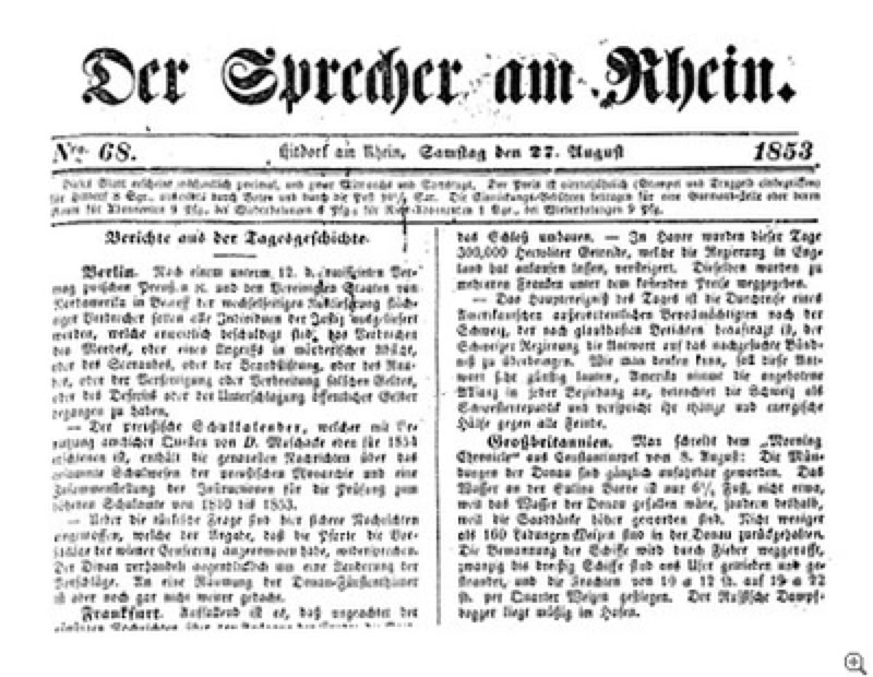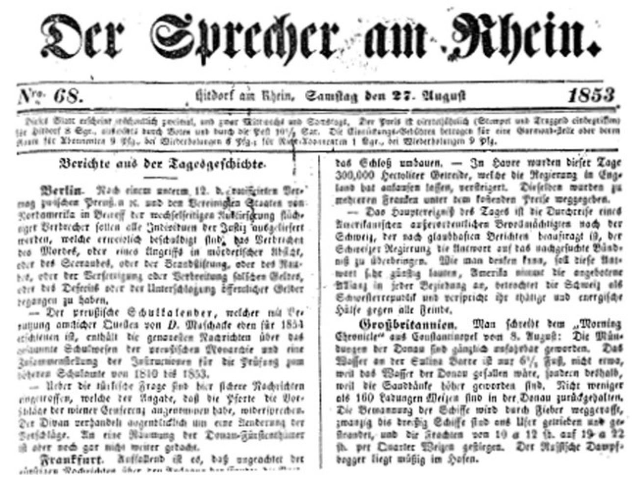 In der Rheinprovinz entstanden 70 Zeitungen. In Hitdorf wurde von Peter Schumacher der „Sprecher am Rhein" herausgegeben. Er soll eine gemäßigt demokratische Ausrichtung gehabt haben.