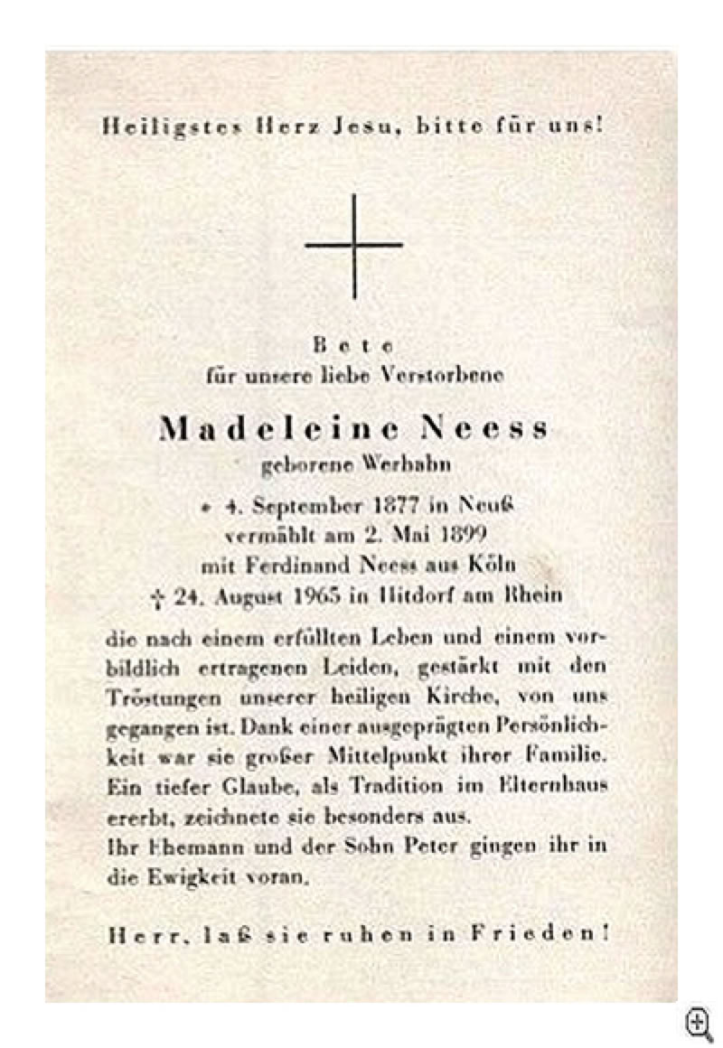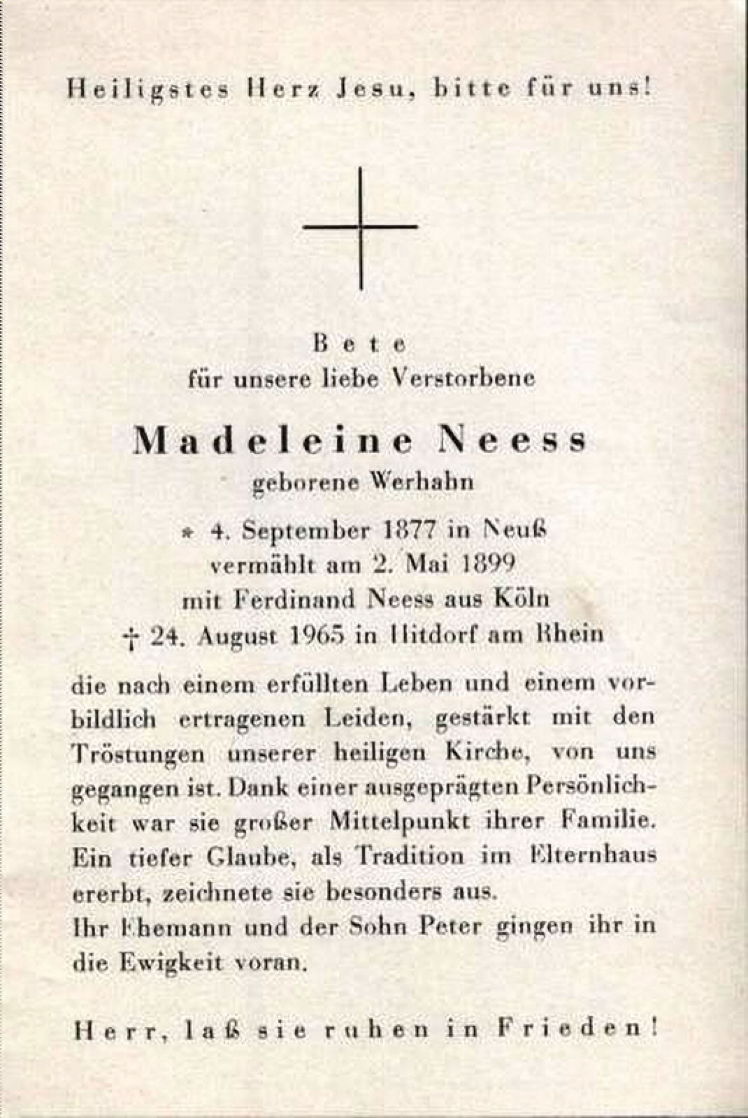 Ferdinand Neess, einer der Brüder, war verheiratet mit Madeleine Werhahn (1877-1965) aus Neuss, die bis zu ihrem Tod in Hitdorf lebte. Nachdem bereits 1918 die Zigarrenproduktion eingestellt werden musste, wurde das Unternehmen 1953 vollständig geschlossen. Das Inventar und die Maschinen wurden an die Firma Dorff verkauft, die allerdings ebenfalls schon 1964 den Betrieb aufgeben musste.