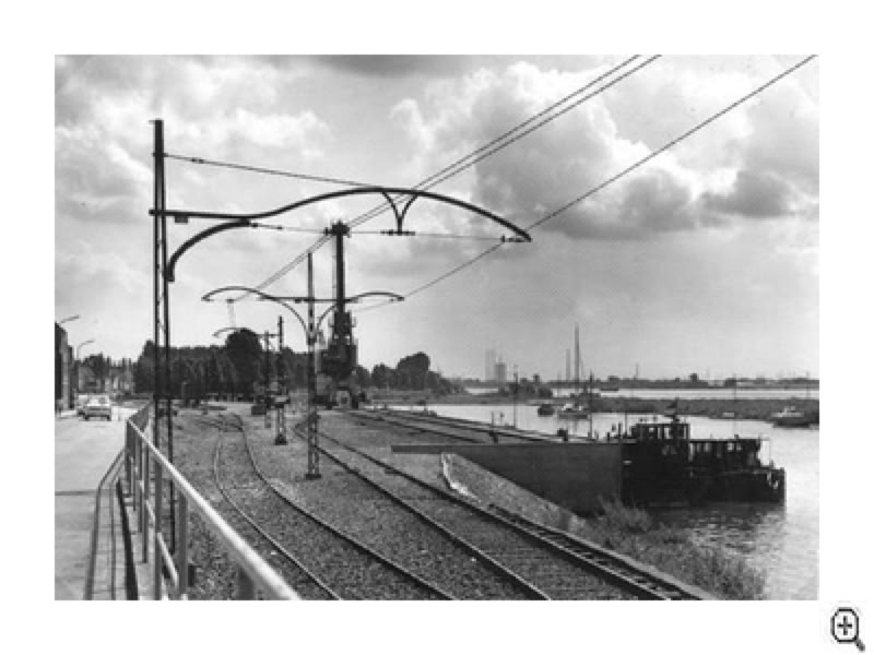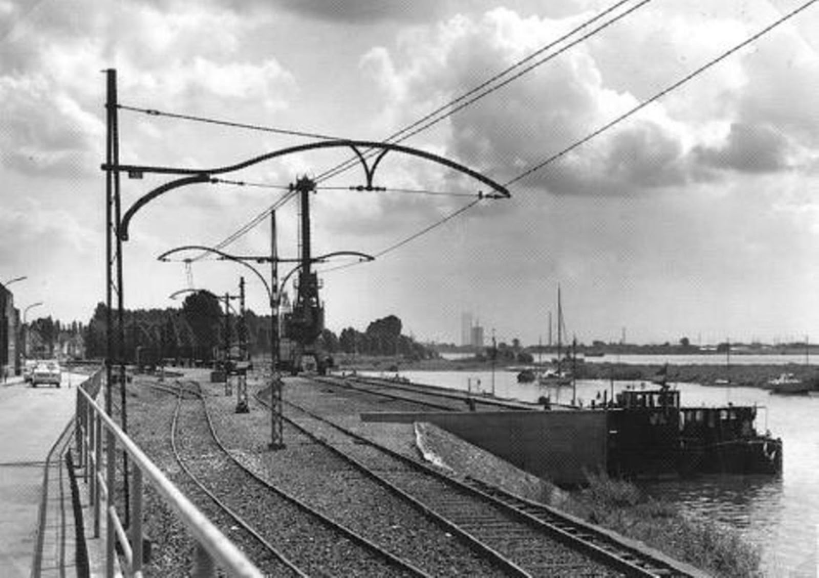 Blick auf den Kai, den DEMAG Kran und die Gleisanlage der elektrischen Kleinbahn 1970