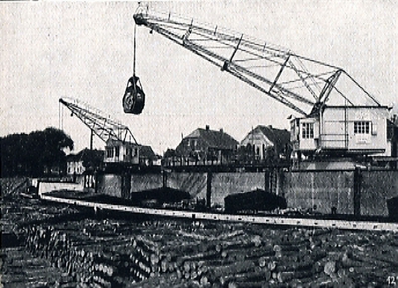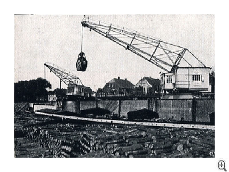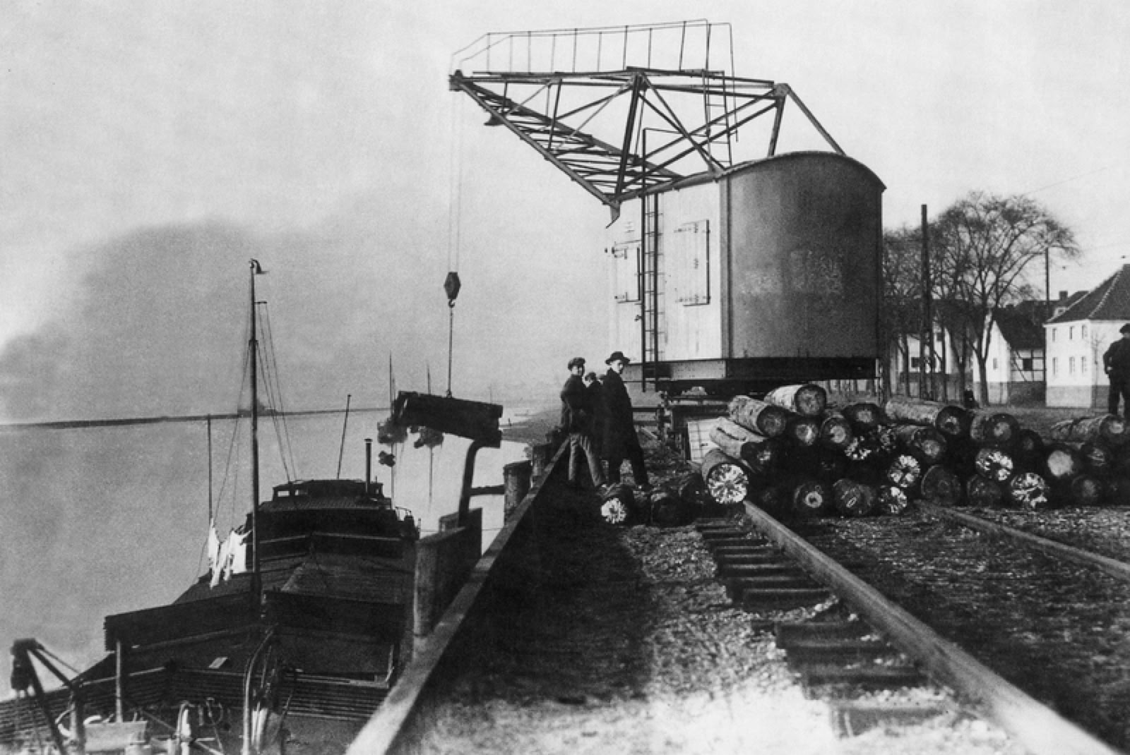 Beide Kräne im Einsatz bei der Holzverladung um 1930