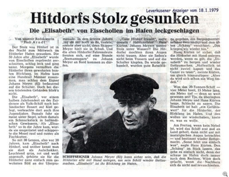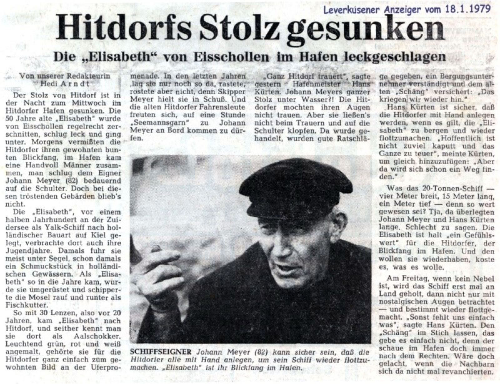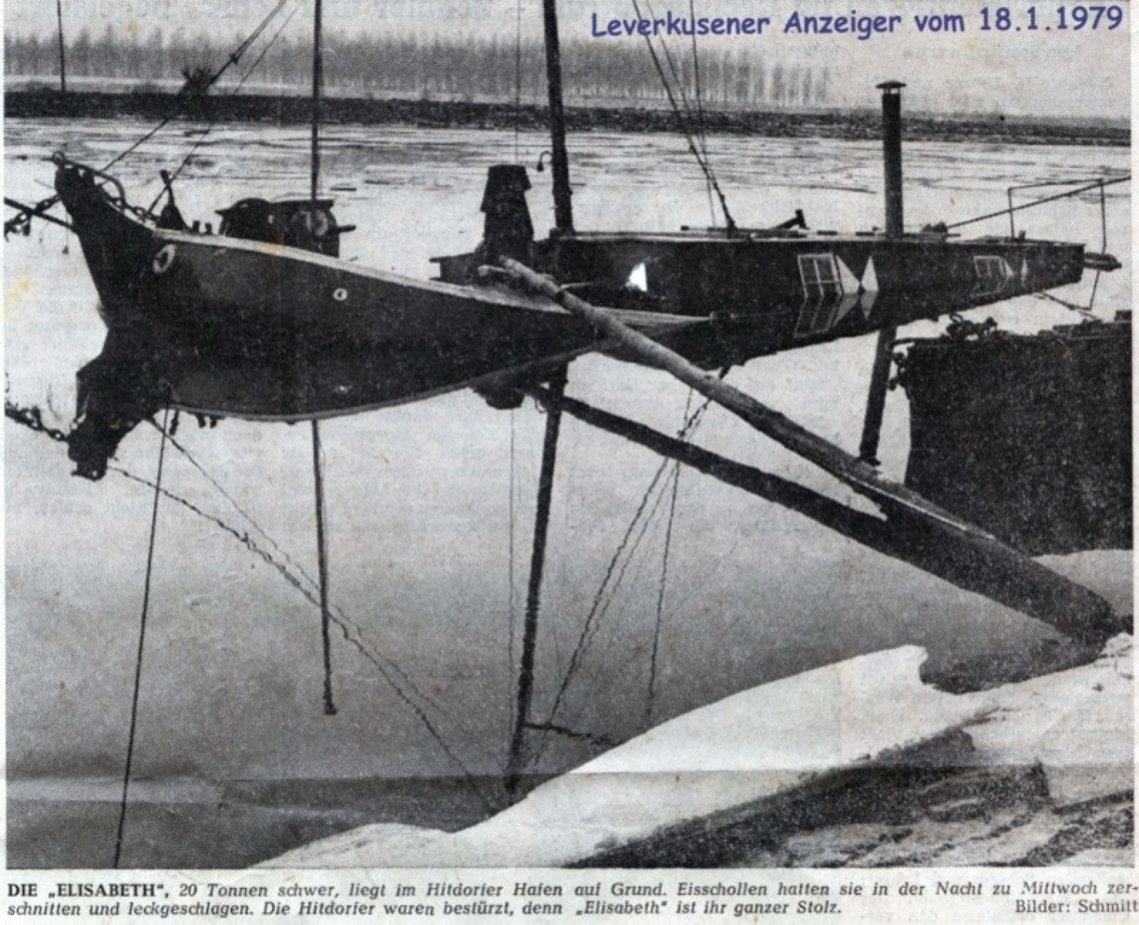 Im Januar 1979 ereignete sich ein schweres Unglück im Hitdorfer Hafen. Das stolze Boot "Elisabeth“, der liebevoll restaurierte und gepflegte alte Aal-Schokker des Fährmannes Johann „Schäng“ Meyer wurde durch Eisschollen versenkt.